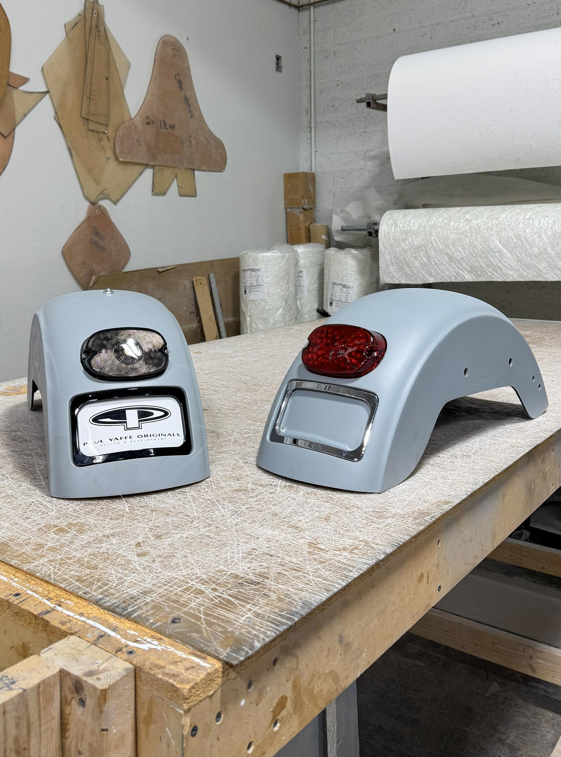 Style your bike with a custom fender with a custom frenched license plate and a custom frenched tail light. Available in your choice of color for license plate frame and tail light.