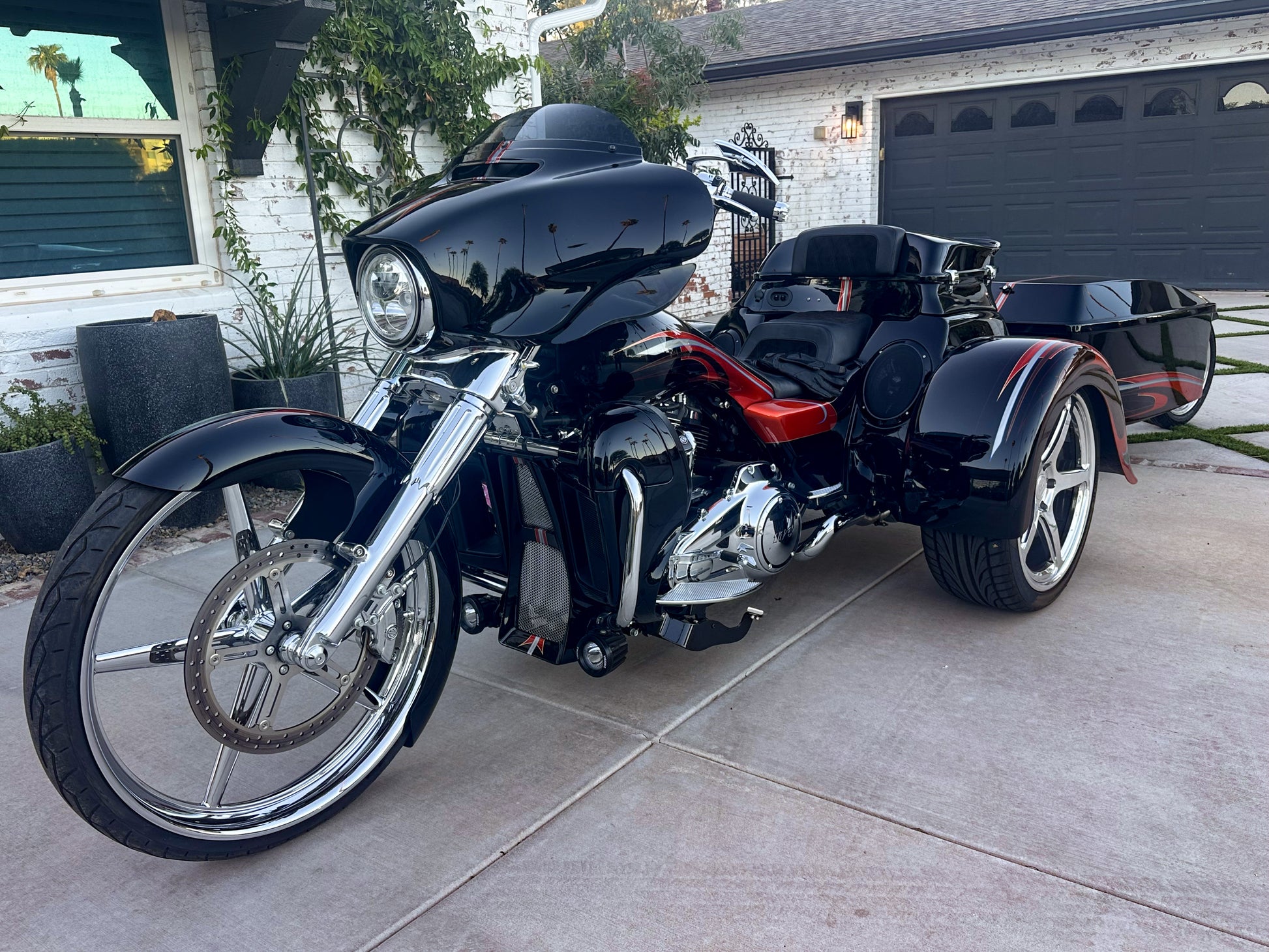 This completely customized Harley-Davidson Tri Glide dominates the set wherever it goes! Everything about this beauty screams custom and attitude. Paul Yaffe and his crew spared no expense creating this truly unique and badass custom trike. From the moment you hear it roar to life you'll be dying to throw your leg over it and take her for a ride! And rip she does! This smooth riding, perfect handling chopper stop traffic wherever it goes! With almost 2 years invested in perfecting every detail this bike is truly one of a kind! The beauty even includes a completely customized trailer that's color matched and equally badass! ("R") logo will be removed at new owners request) This trike must be seen to be believed. With well over $100,000 invested and almost two years in creation, now offered at $79,000 in perfect, as new condition.