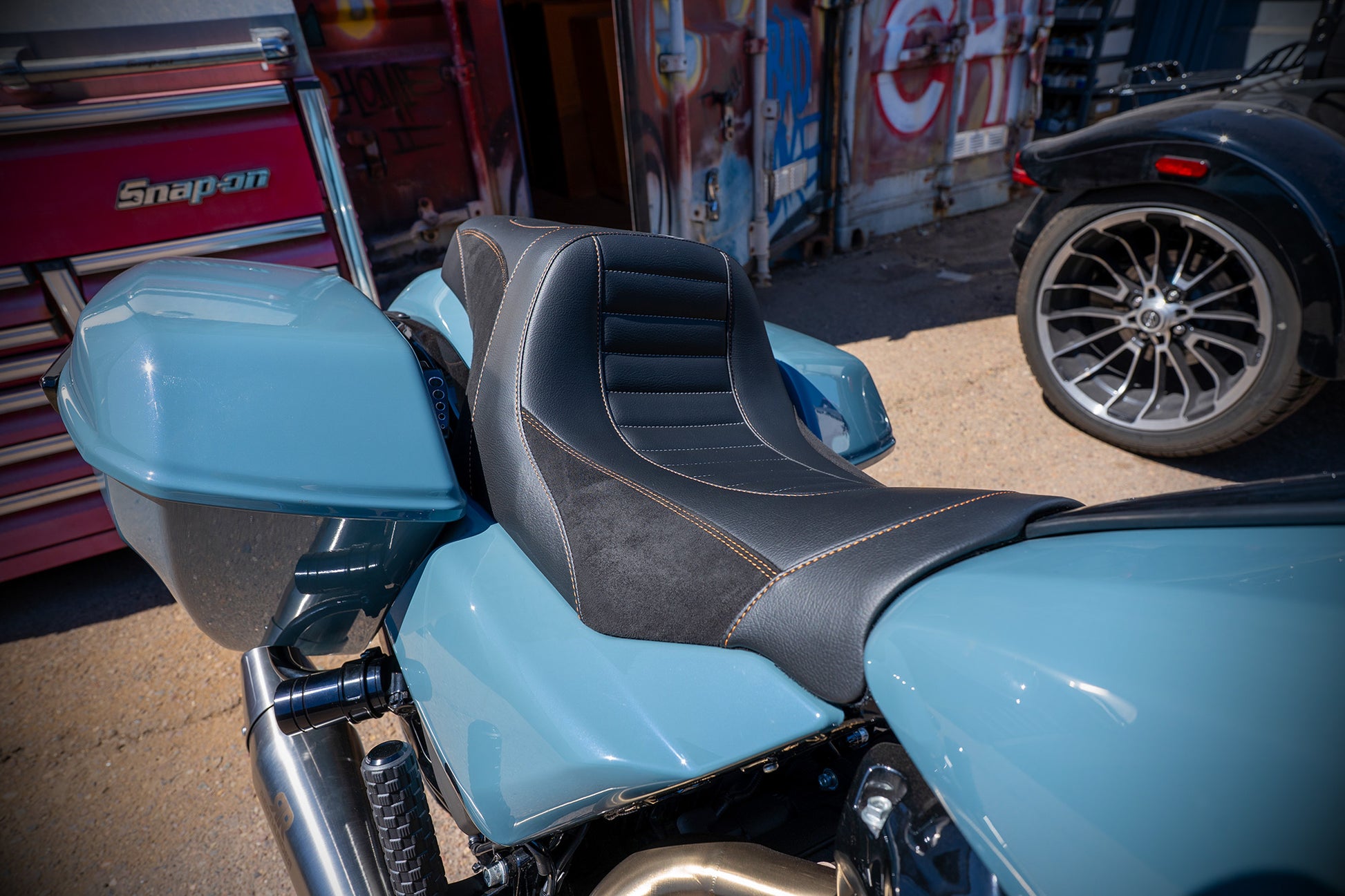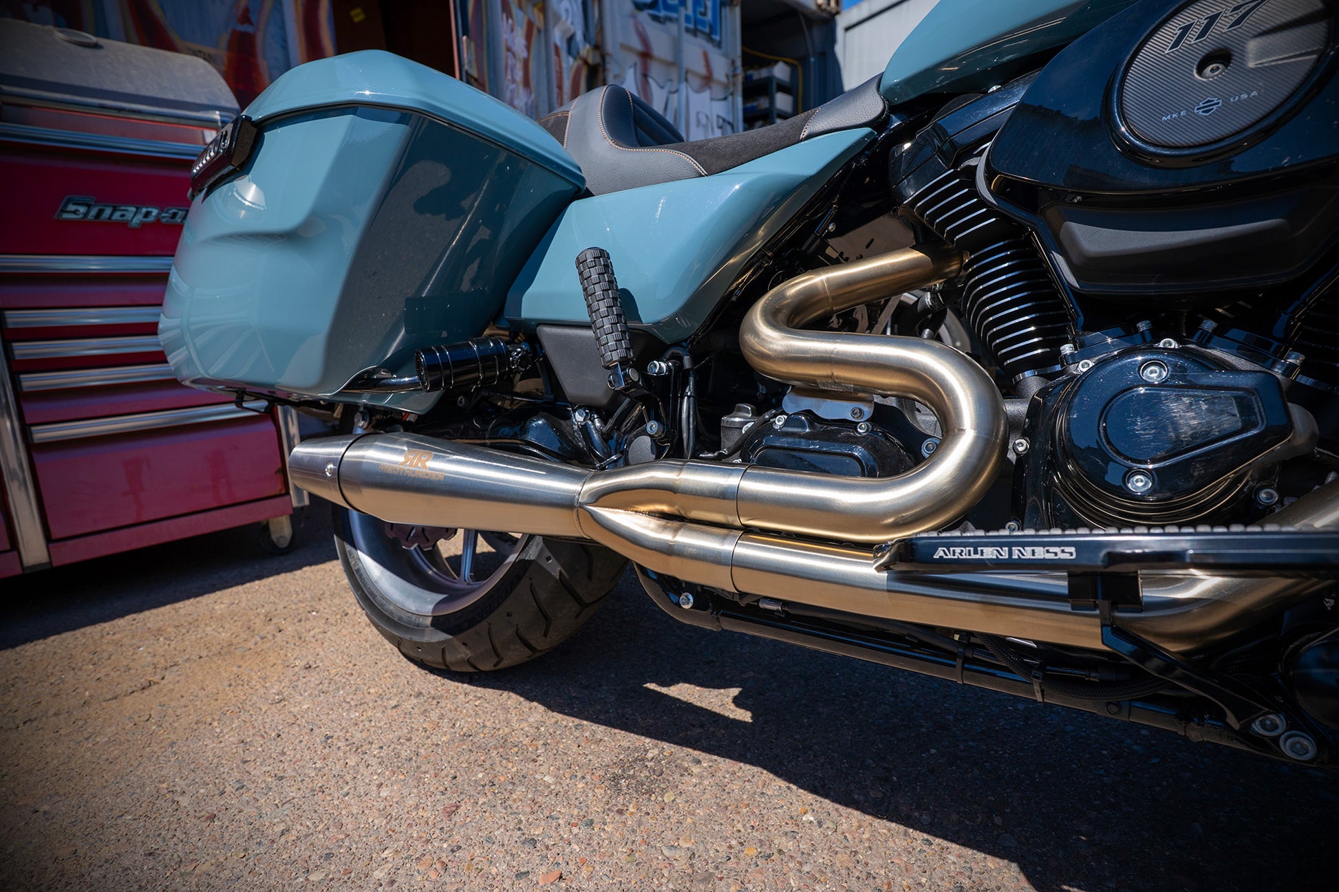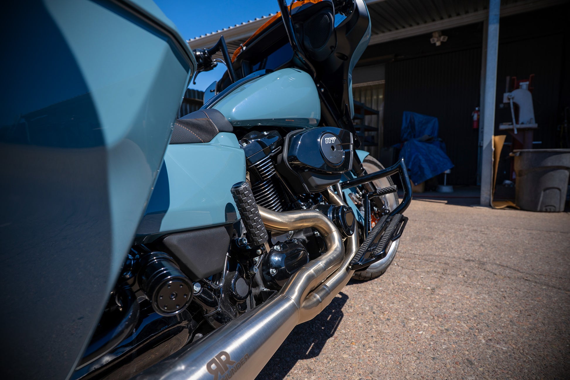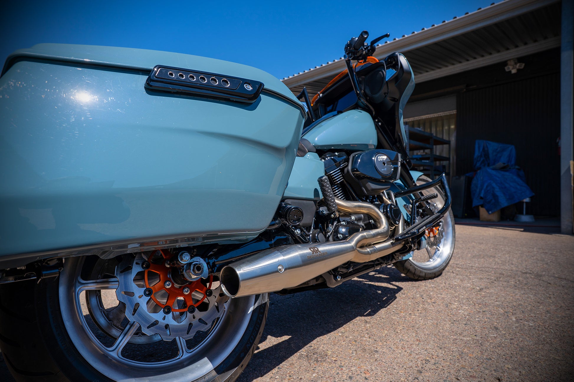 Paul grabbed this Shark Skin colored 2024 Street Glide with the specific intention of tricking it out to handle the performance needs of his upcoming ride to the 85th Sturgis Rally. Horsepower, Handling and Comfort were the goals and man he nailed it! From the MotoGP Italian suspension and 130 HP 117, to the stunning brushed custom wheels, amazingly comfortable custom seat and of course our world famous Monkey Bars this ripper checks all the boxes! Paul says he loves the way the color hits against the orange and brushed finishes. He loves the Red Thunder pipe and says it sounds ferocious! Paul also said the bike performed flawlessly on its 4000 mile journey to the Black Hills. He planned on adding orange and silver graphics and a couple carbon fiber accents to the bike as finishing touches. The bike is offered at $49k as is (about $16k) off of retail. OR, you could choose to let him