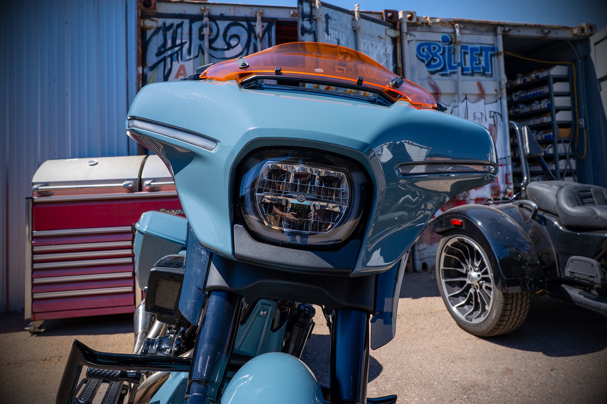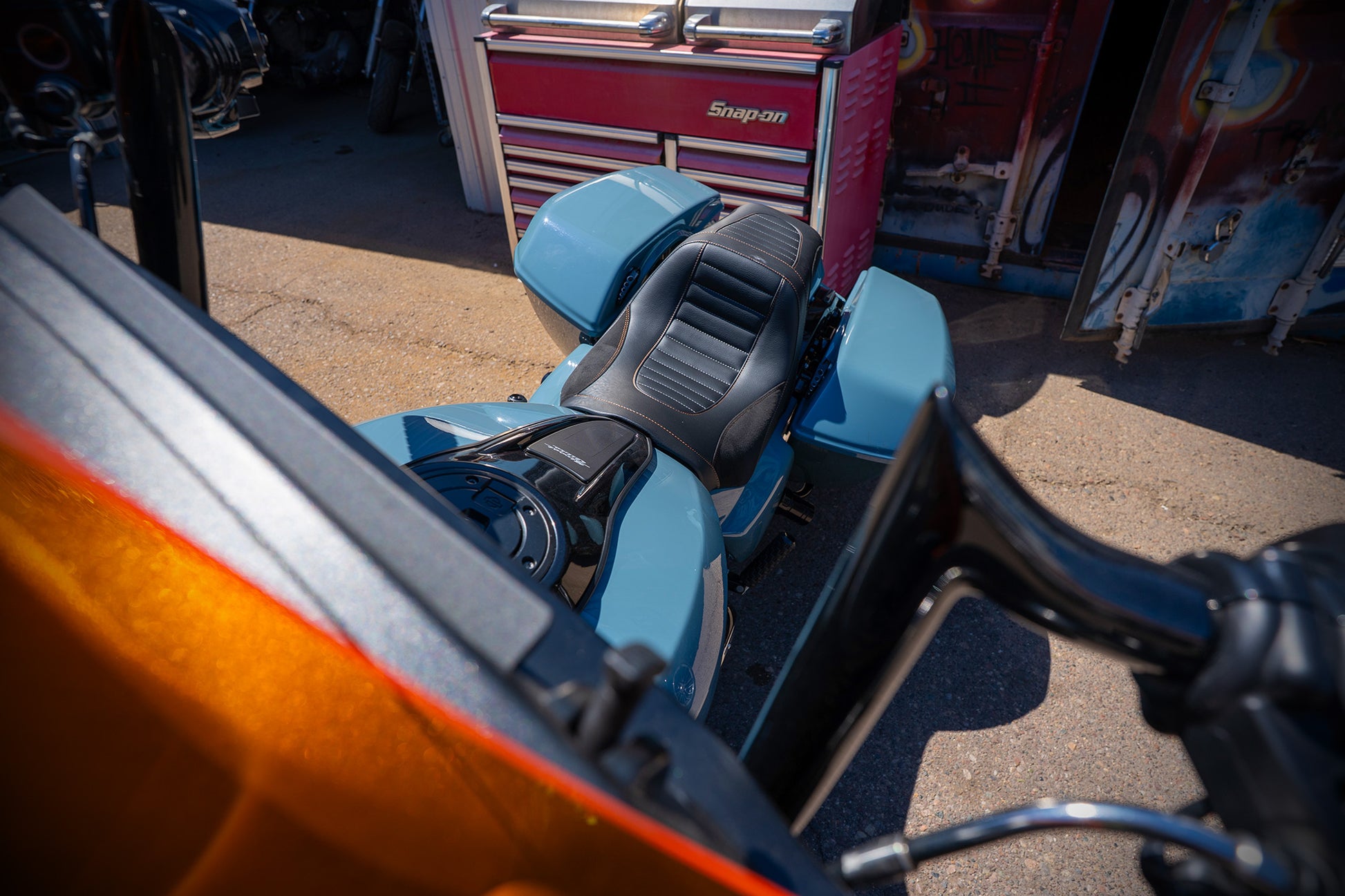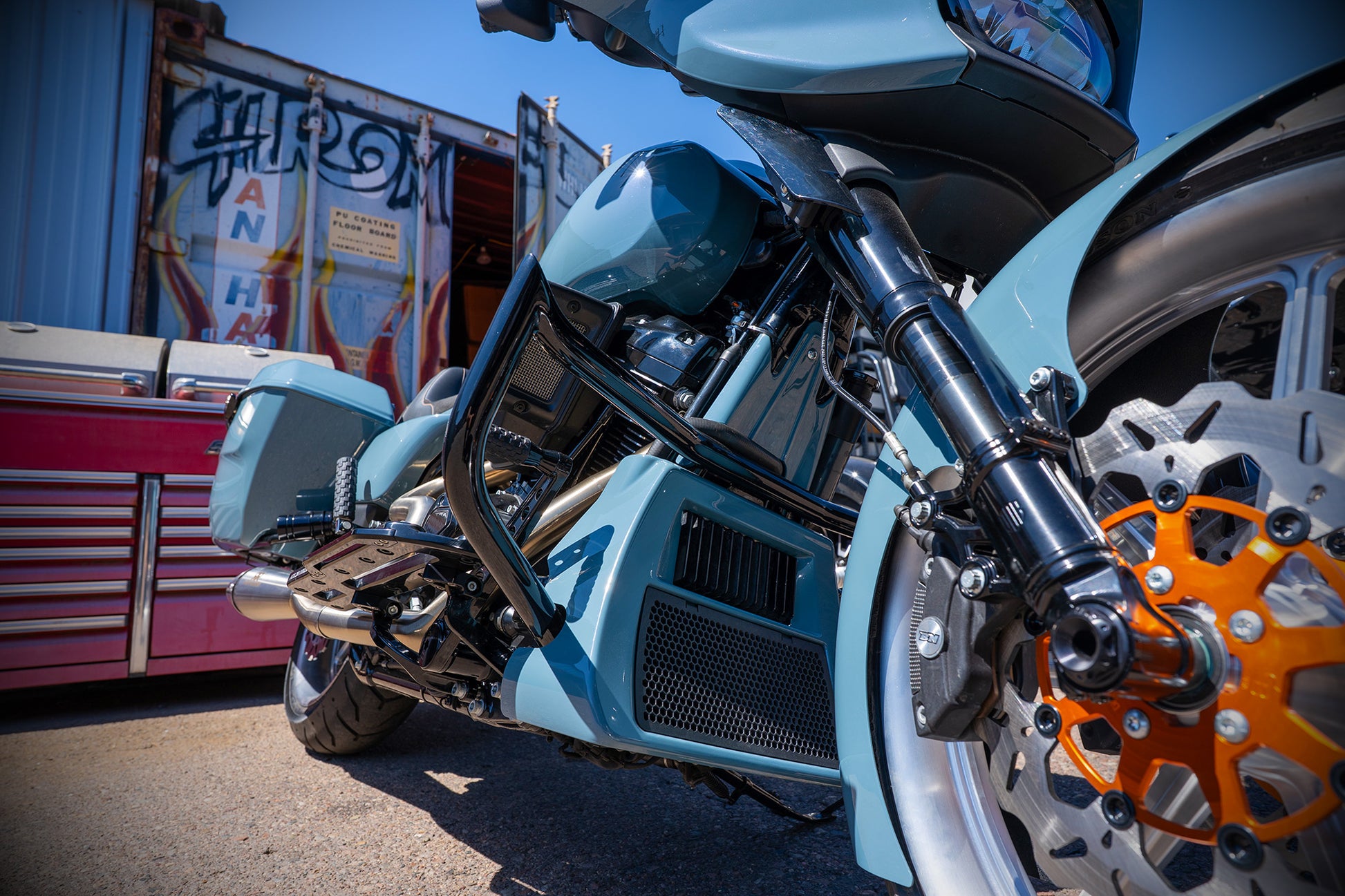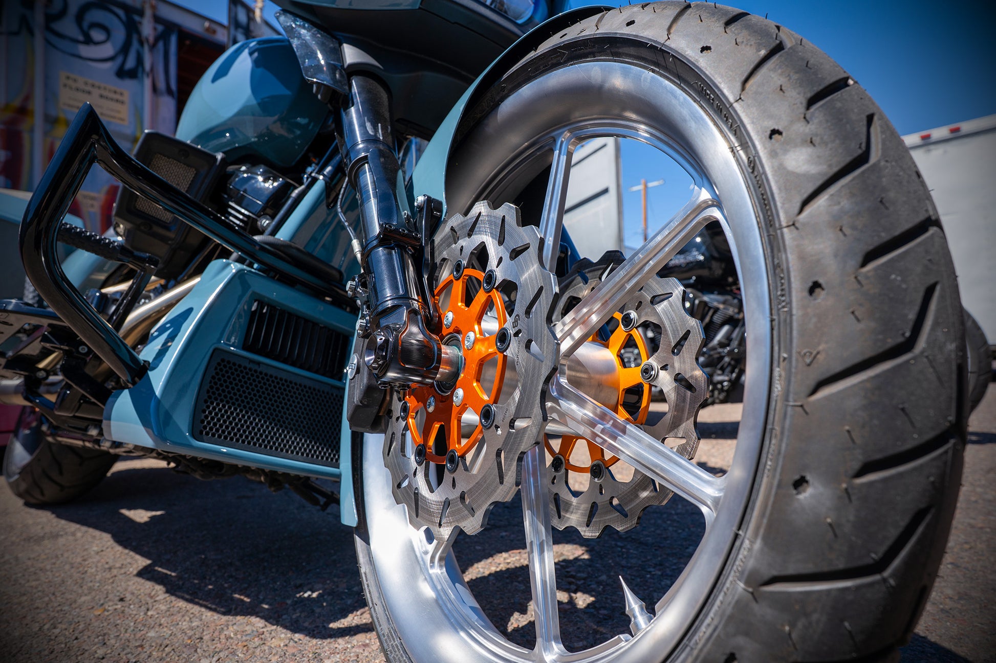 Paul grabbed this Shark Skin colored 2024 Street Glide with the specific intention of tricking it out to handle the performance needs of his upcoming ride to the 85th Sturgis Rally. Horsepower, Handling and Comfort were the goals and man he nailed it! From the MotoGP Italian suspension and 130 HP 117, to the stunning brushed custom wheels, amazingly comfortable custom seat and of course our world famous Monkey Bars this ripper checks all the boxes! Paul says he loves the way the color hits against the orange and brushed finishes. He loves the Red Thunder pipe and says it sounds ferocious! Paul also said the bike performed flawlessly on its 4000 mile journey to the Black Hills. He planned on adding orange and silver graphics and a couple carbon fiber accents to the bike as finishing touches. The bike is offered at $49k as is (about $16k) off of retail. OR, you could choose to let him