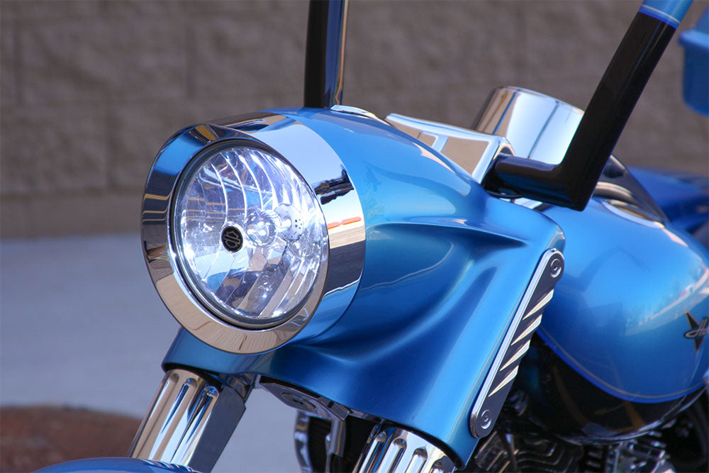 When you rake your Road King®, and you don’t address the headlight, your light will be pointing to the sky like the Bat Signal... That's NO BUENO! Paul solved the problem with the Bagger Nation Raked Nacelle. This not only corrects the headlight position but adds some killer styling at the same time! Each high-pressure composite Nacelle fits our raked trees perfectly and will accept your stock riser cover, cowling spear, and headlight assembly. Our Raked Road King®Nacelle is made as a lightweight composite and is primed, ready for mock-up, prep & paint! Your painter will love you... and us.