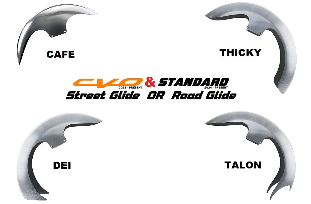 Bagger Nation steel fenders have been a best seller for years on Touring bikes. Now are available for the ALL NEW 2023 Street Glide & Road Glide CVOs! Choose from four killer-looking front fenders to be the perfect complement to your CVO Street Glide OR Road Glide.