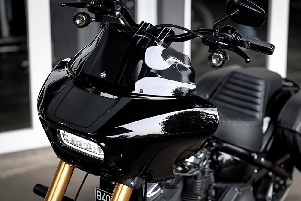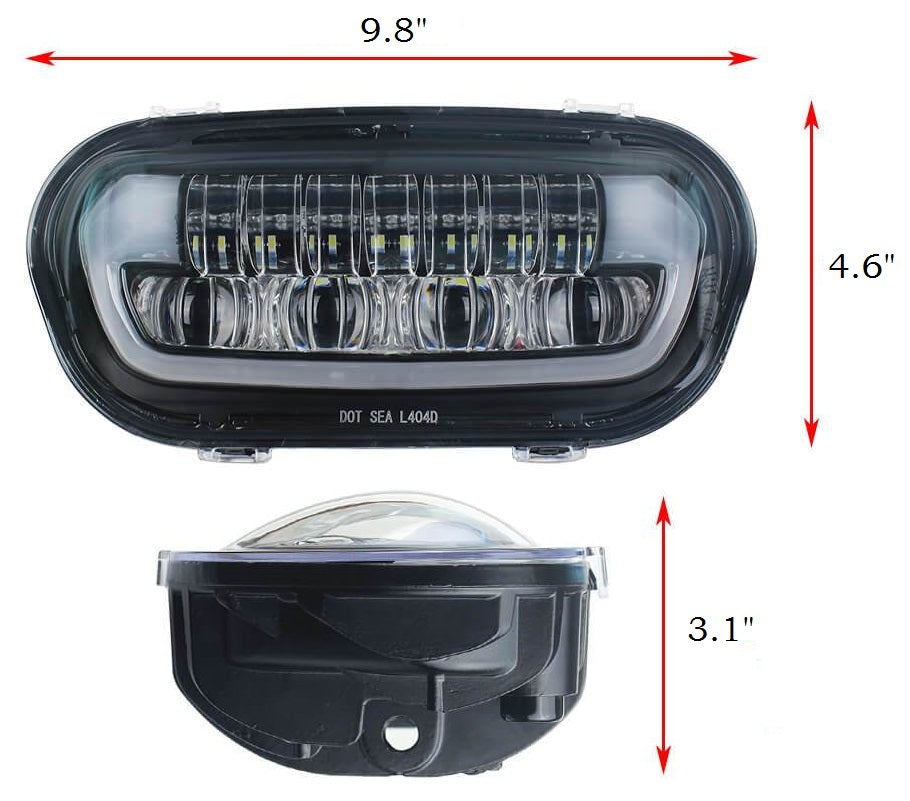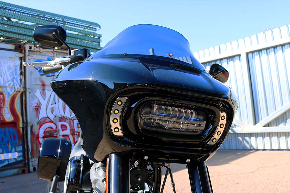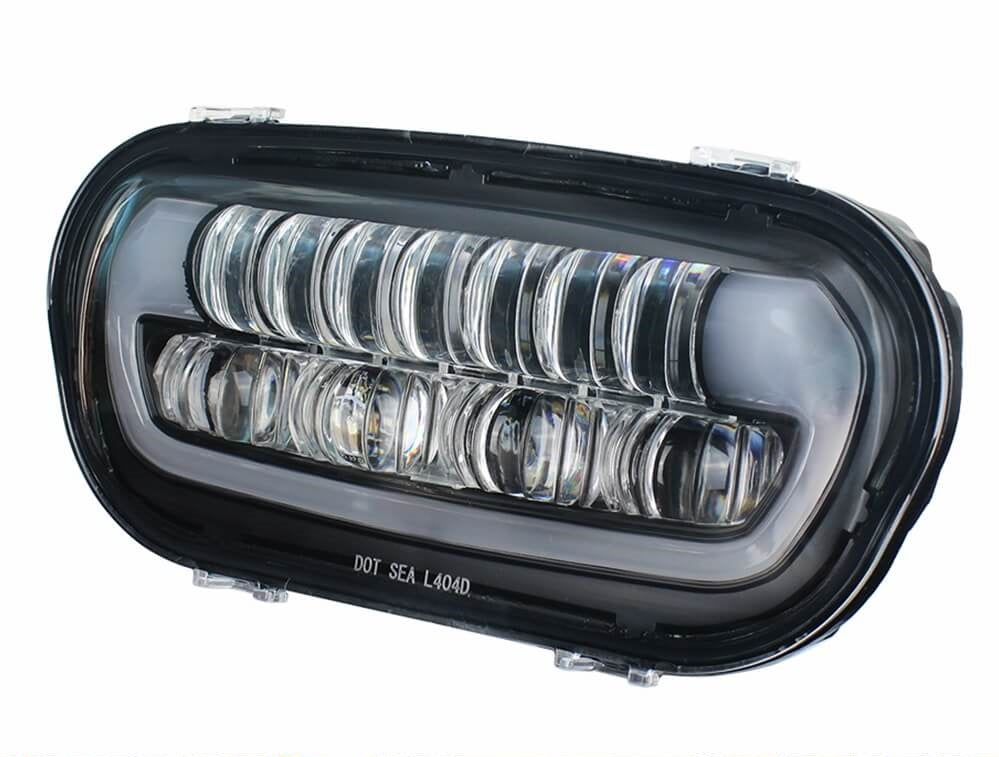 The NEW 9.8″ headlamp from Bagger Nation will fit all of the Bagger Nation Sharknado® Fairings as well as replace the H-D 2018 to Present Fat Bob headlamps. It features a black aluminum housing with a polycarbonate lens, and it comes with a 4-pin connection, L.E.D. headlamp w/white DRL Daylight Running Light, and a 40% brighter high/low beam. This headlight gives you an almost stadium blast of light, covering the entire street in front of you. Plus, everyone else in the traffic will also see you.