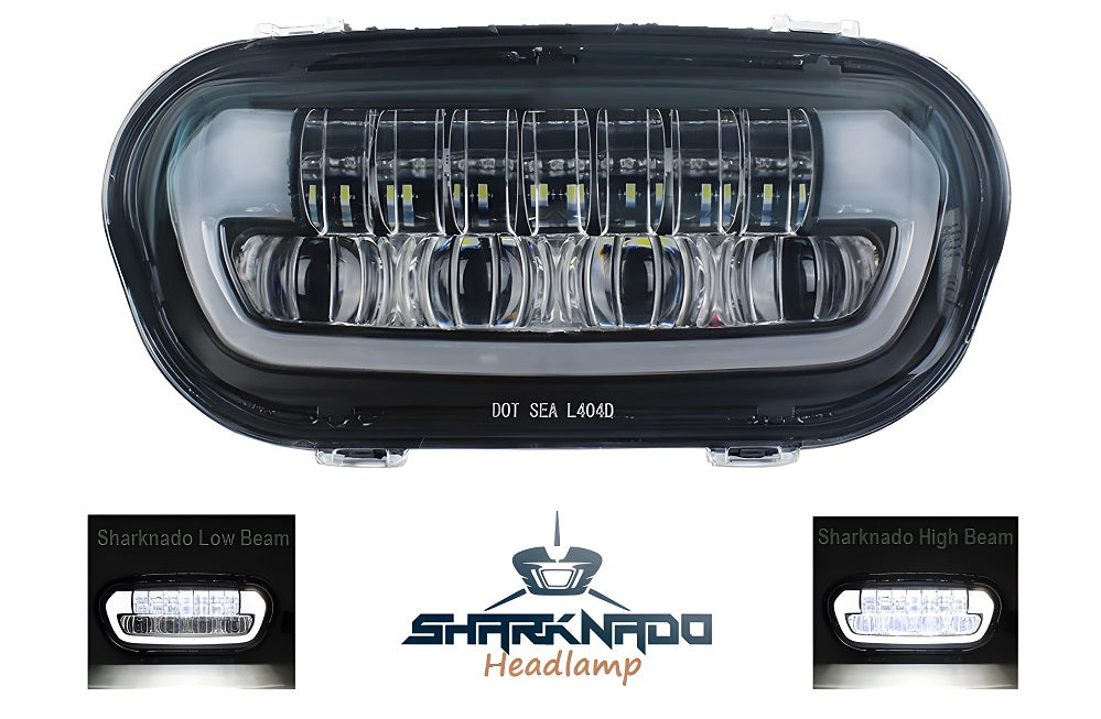 The Bagger Nation Sharknado headlight provides a 40% brighter beam in a focused pattern to guide you through the night! The LED array features a halo design creating a standout appearance the demands attention! The world’s most unique fairing design demanded a headlight equally unique. The Sharknado® Headlight is a direct bolt on item for our Sharknado® Fairings and is plug & play on all M8 Softail Models*