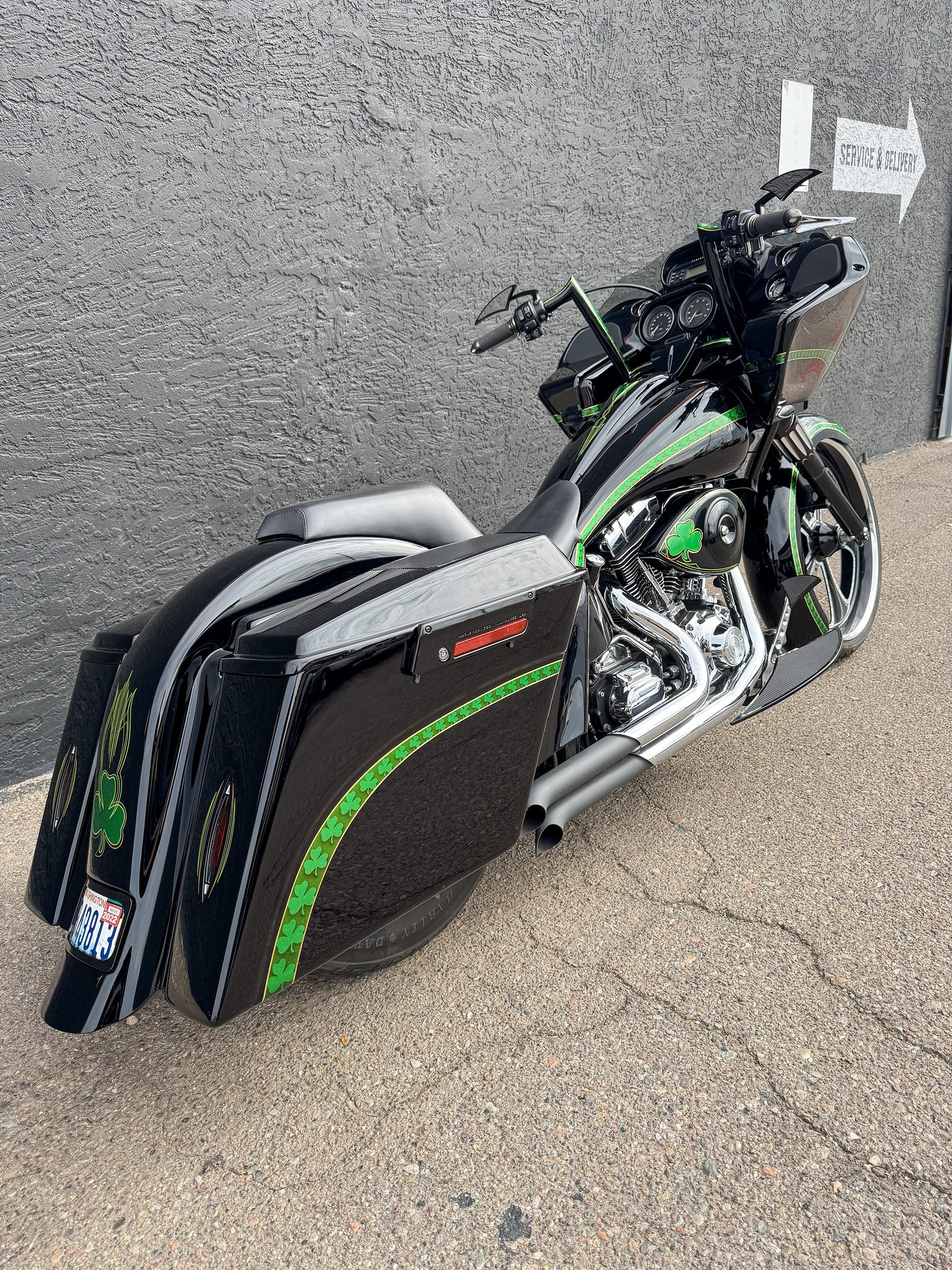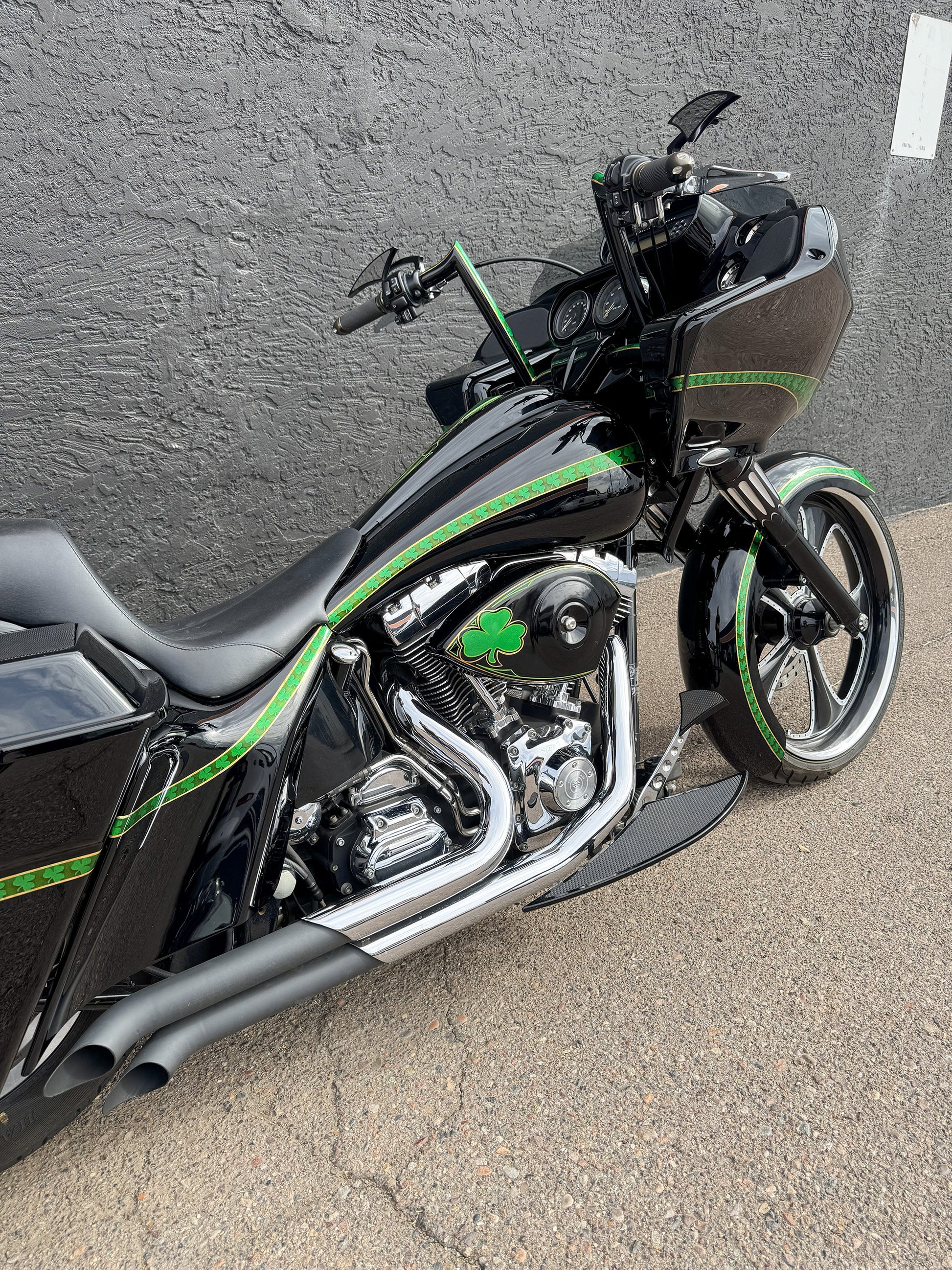 This bike fools them all! First look reveals a beautiful custom big wheel bagger with all the fixin’s! Closer inspection tells you this bikes secret illusion… It’s actually a fully customized 2001 HD Fatboy Softail!