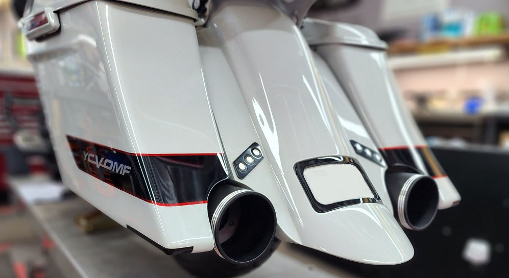 The Bagger Nation Swoop 3-Piece Stretched Rear End Kit can transform a stock Bagger into a killer custom! The Swoop Fender is equipped with our Stealth II Frenched License Plate Frame with hidden L.E.D.s and can be ordered with an array of our laser-bright Lightning Bolt or our Thunder Bolts, both with C.O.B. technology. When ordered with our taillights, we will plot out and drill the fender for your light choice for no additional charge. You also get Bagger Nation’s Swoop Curved stretched saddlebags which are direct bolt-on replacement bags that utilize your stock hardware & lids. These NEW Swoop Saddlebags feature our exclusive Skid Blocks built into the outside of the bag! No flimsy stick on plate here! Paint it, chrome it, heck… dip it in gold if you want. The Swoop Saddlebag Skid Blocks are now an accessory!