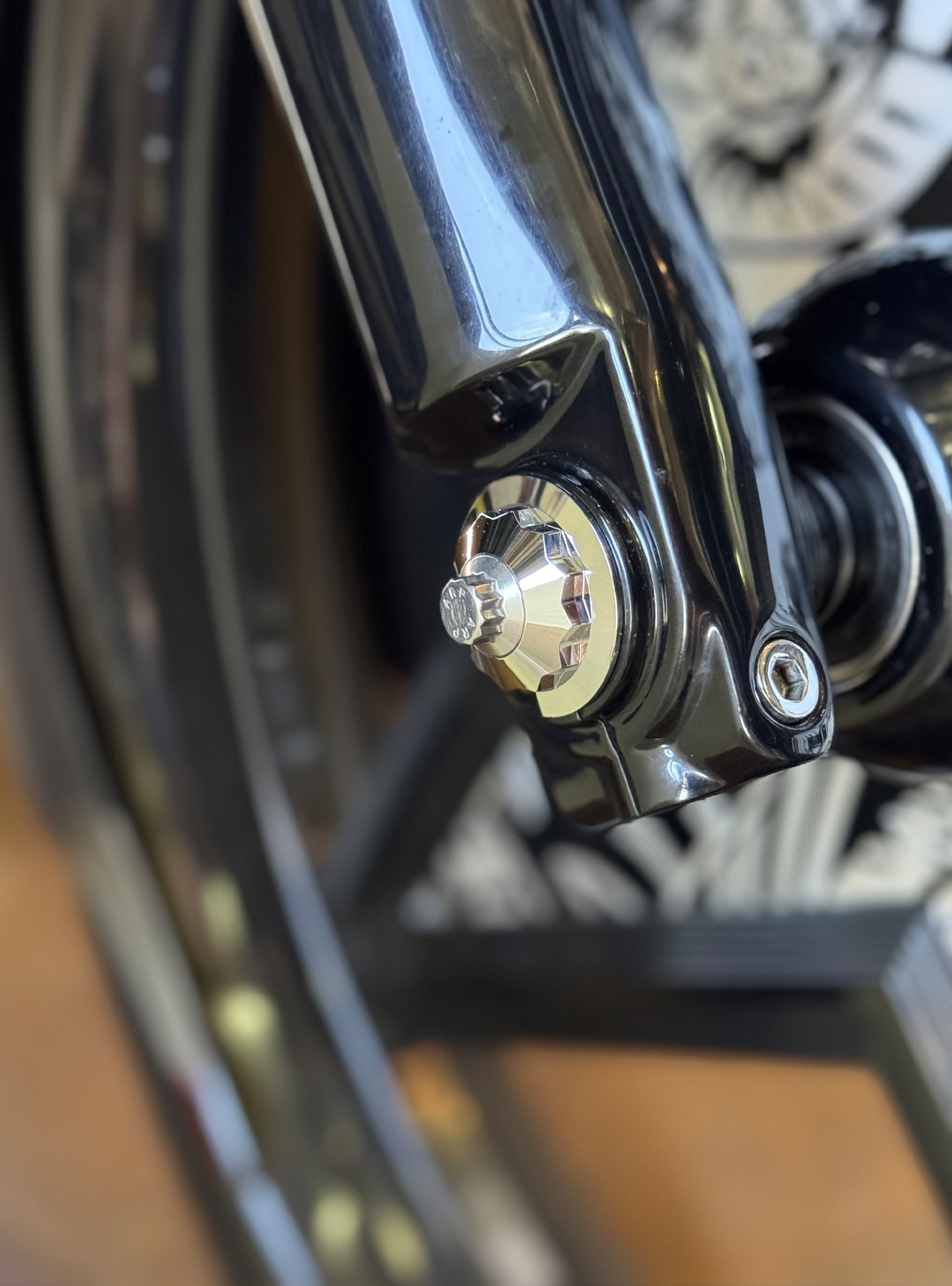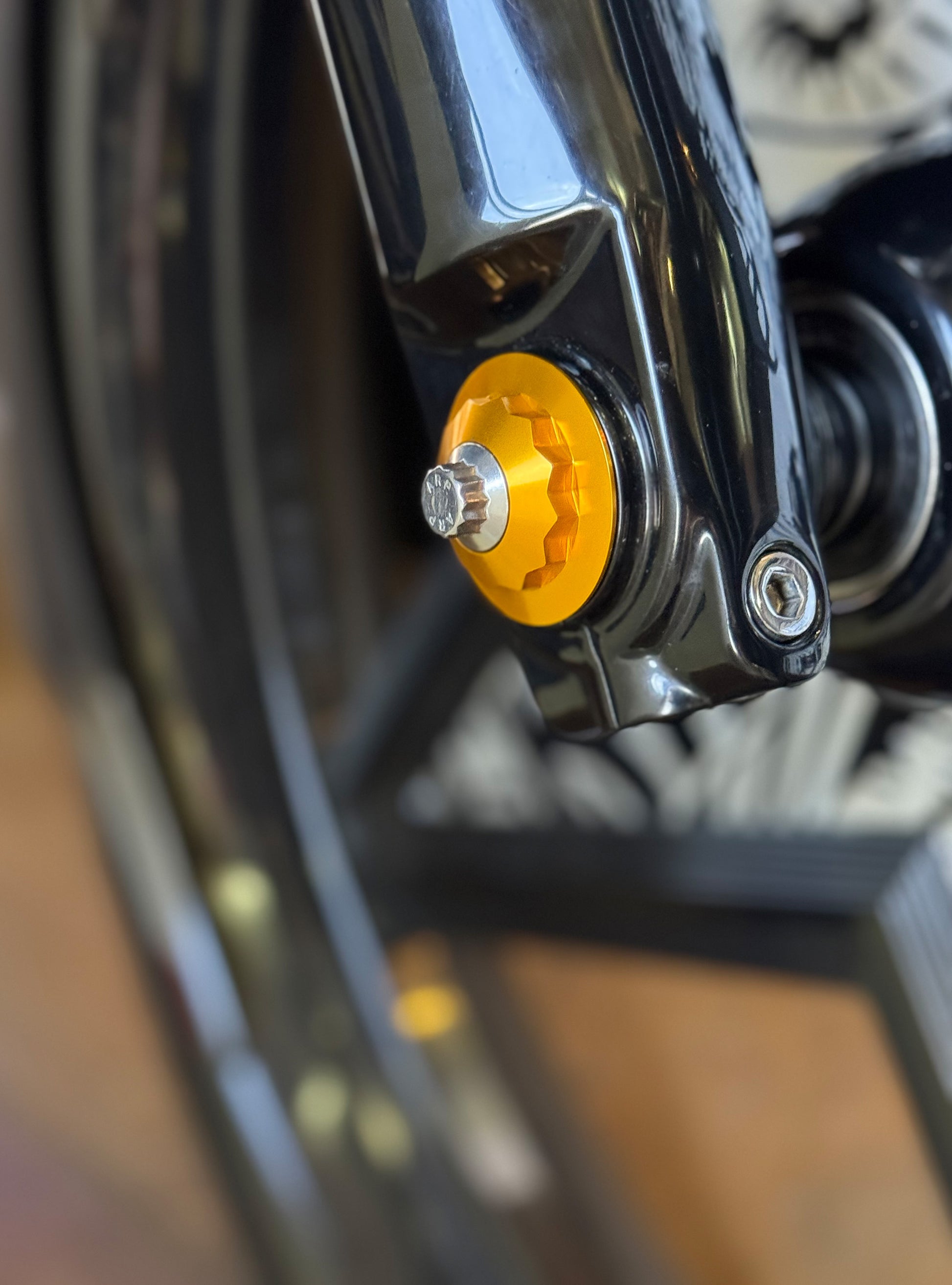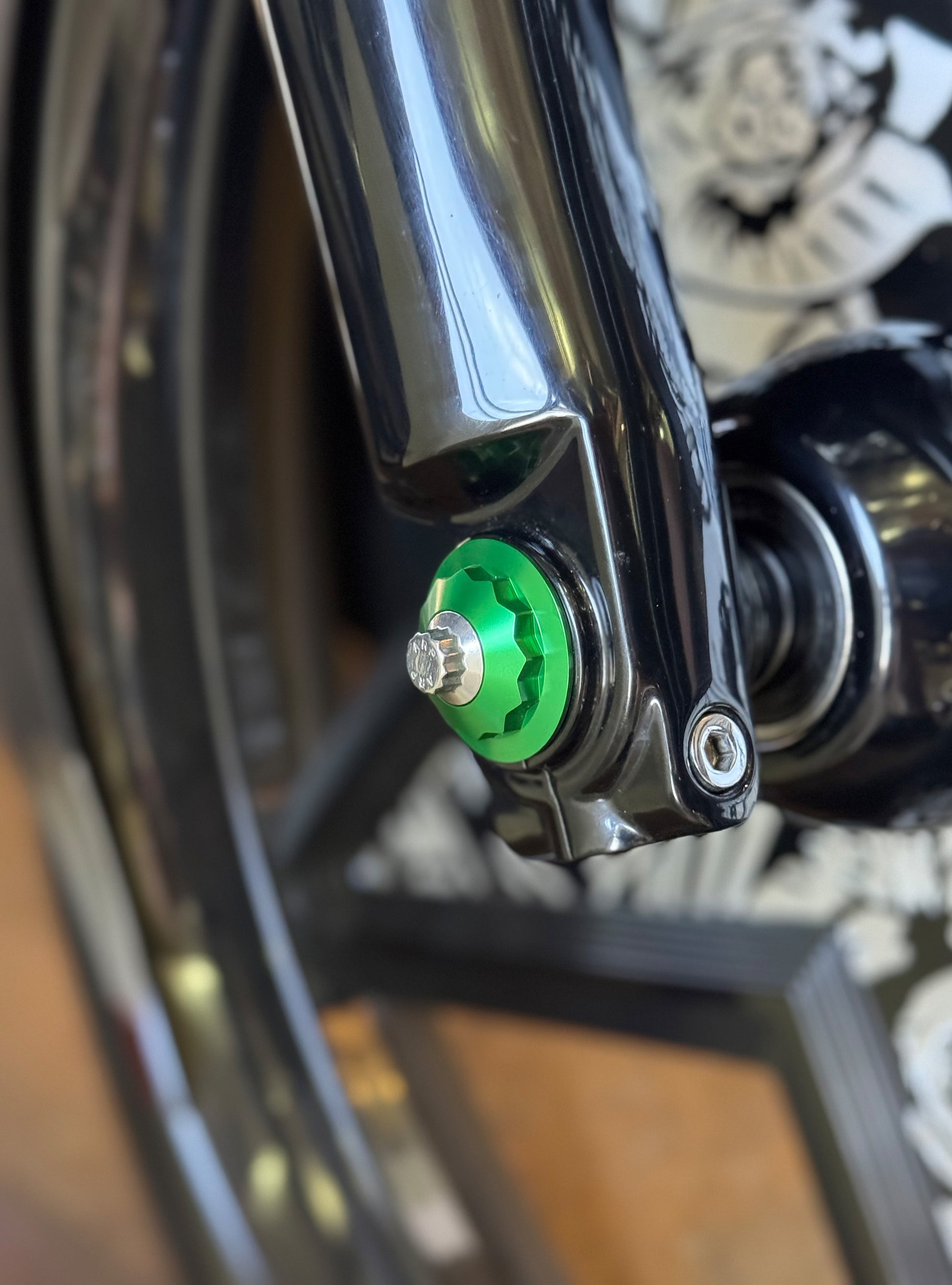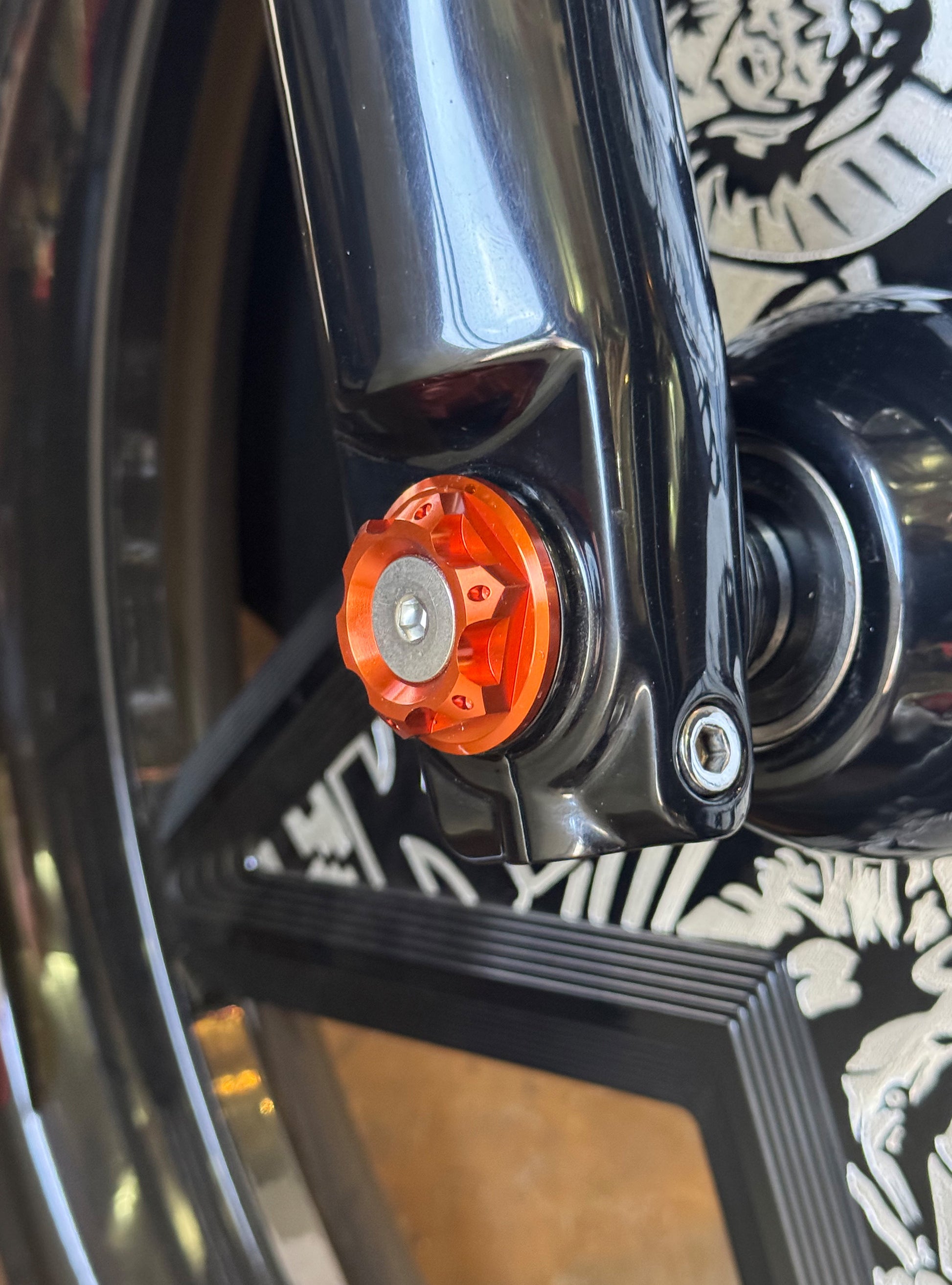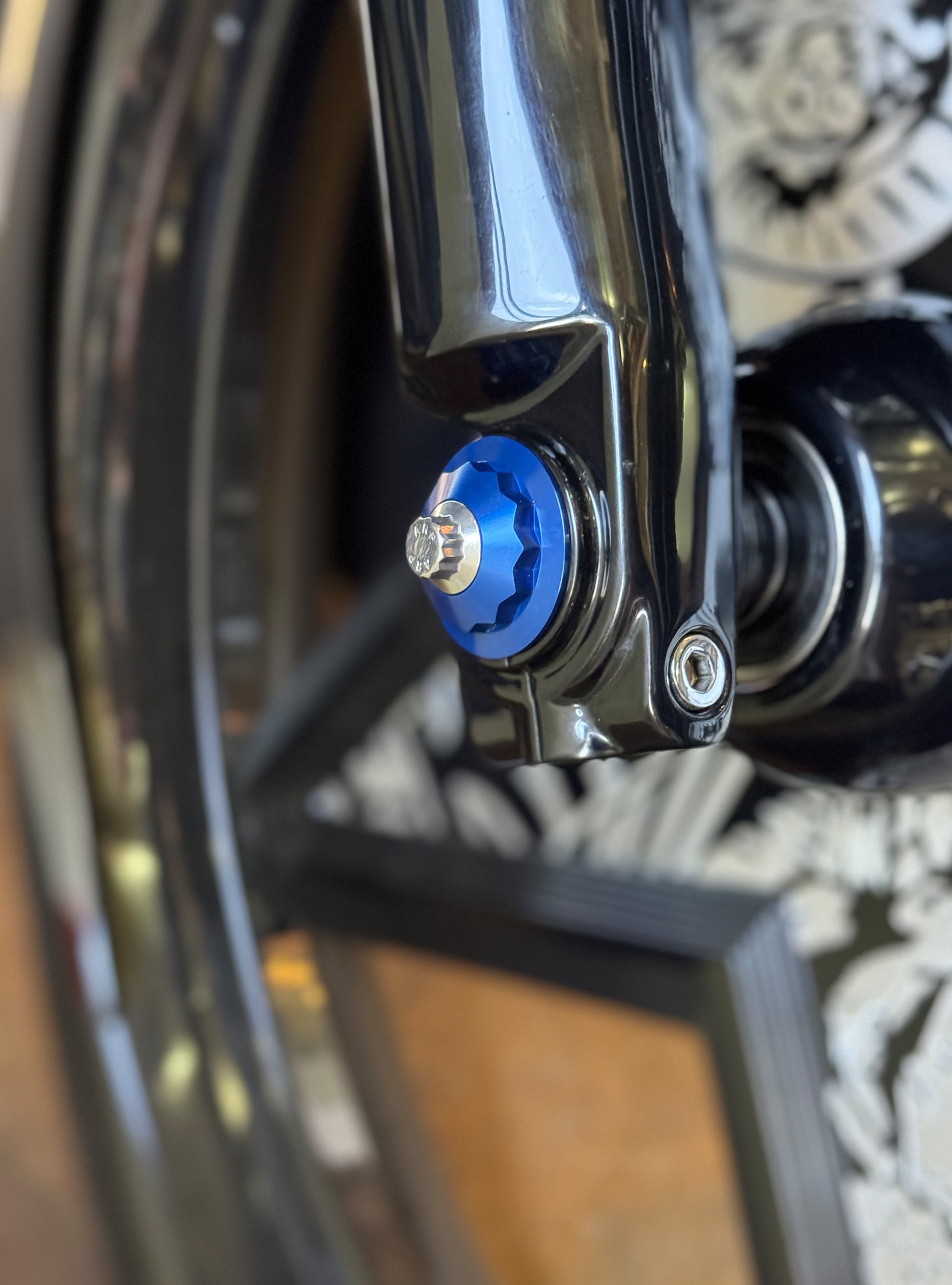 The "Yaxle" Custom Front Axle makes your boring stock forks look completely custom by removing the big ugly stock axle and replacing it with our killer performance minded custom end caps.