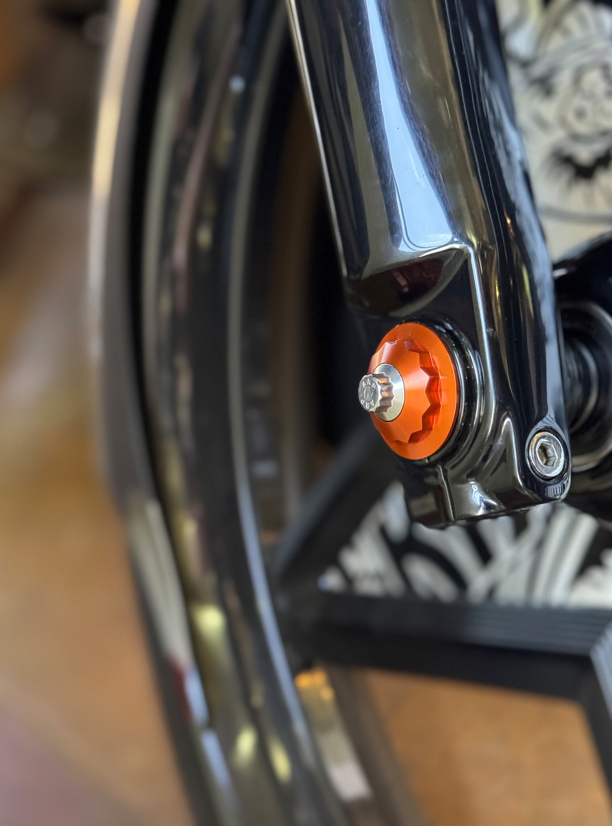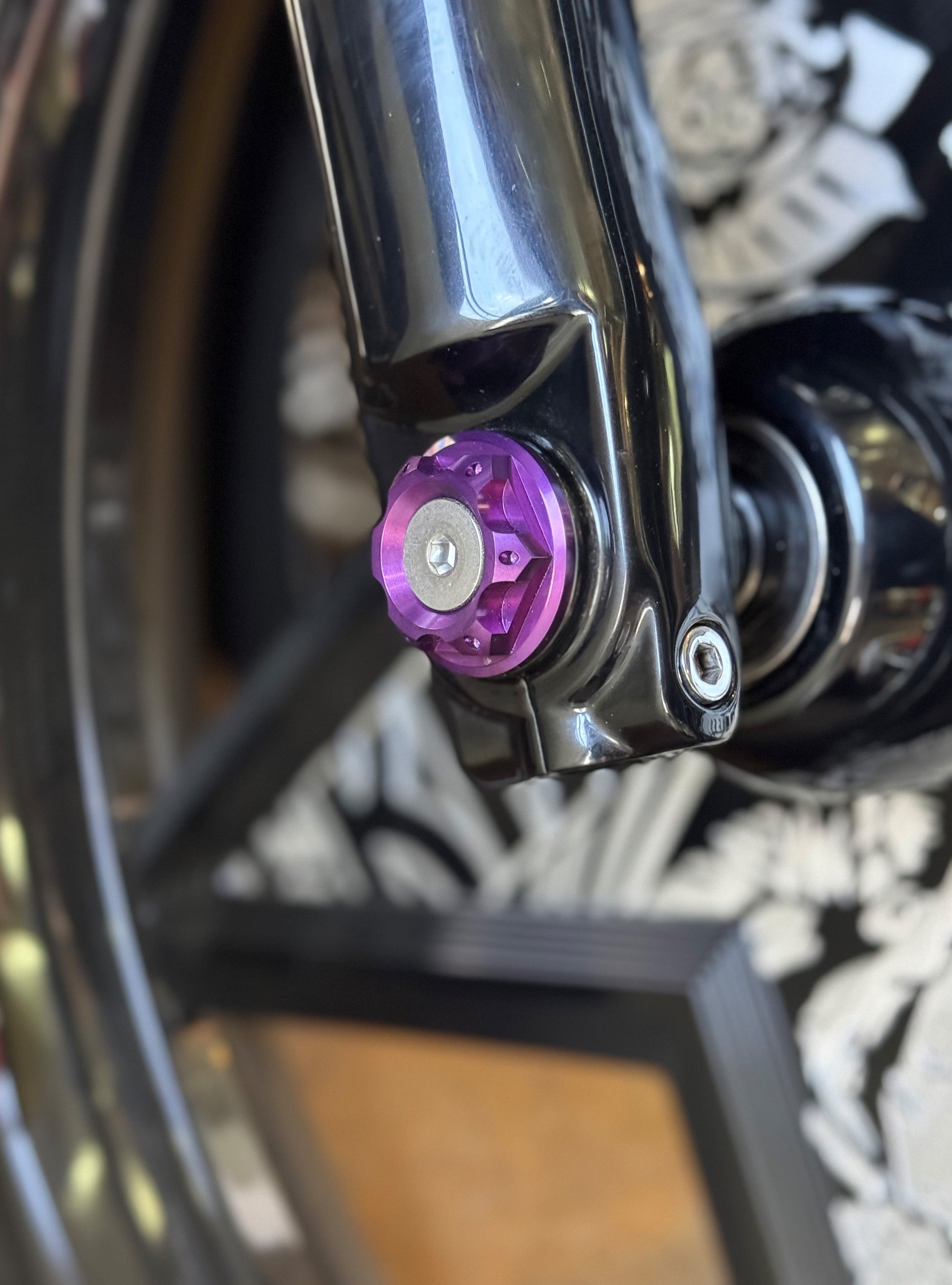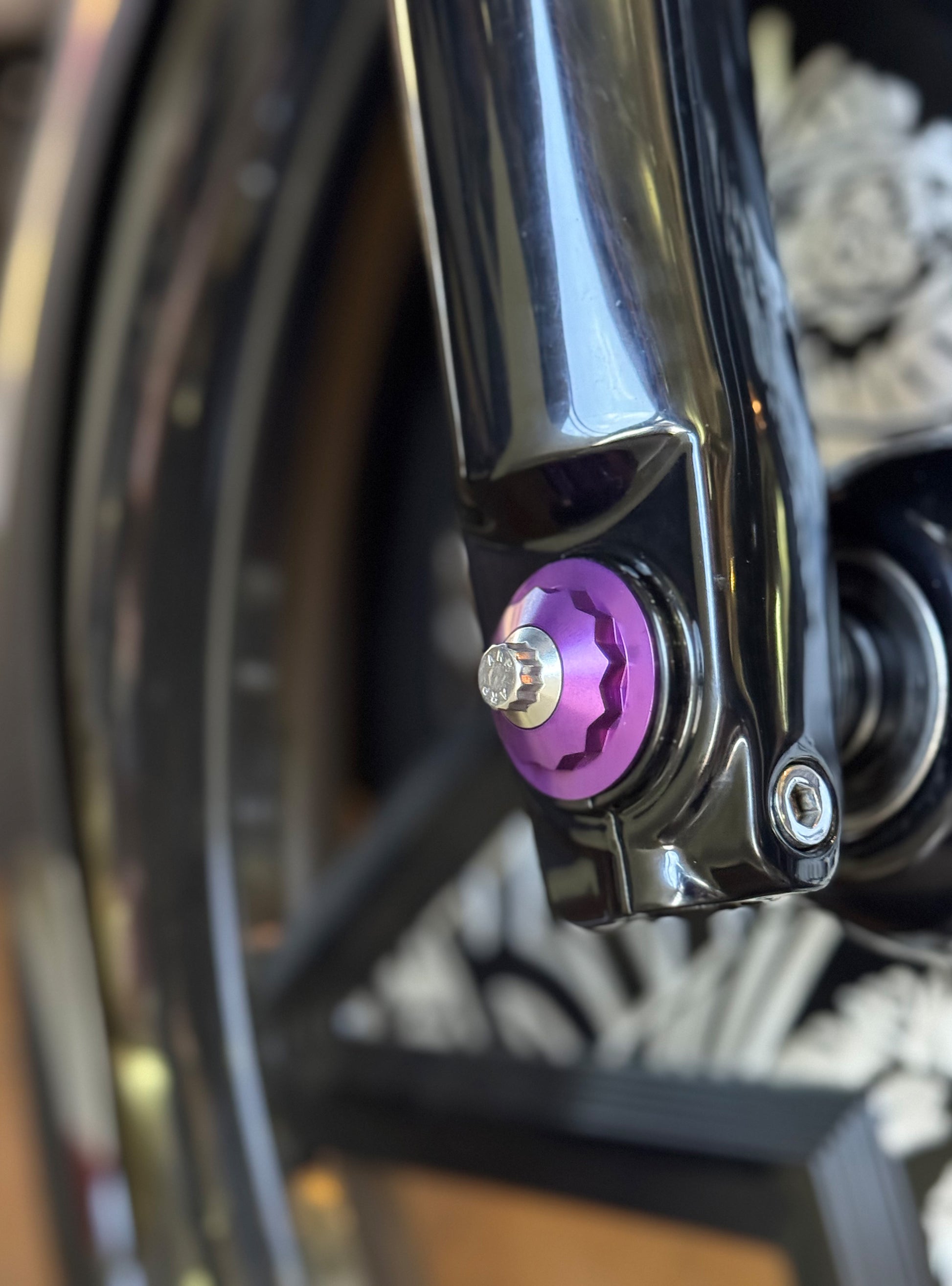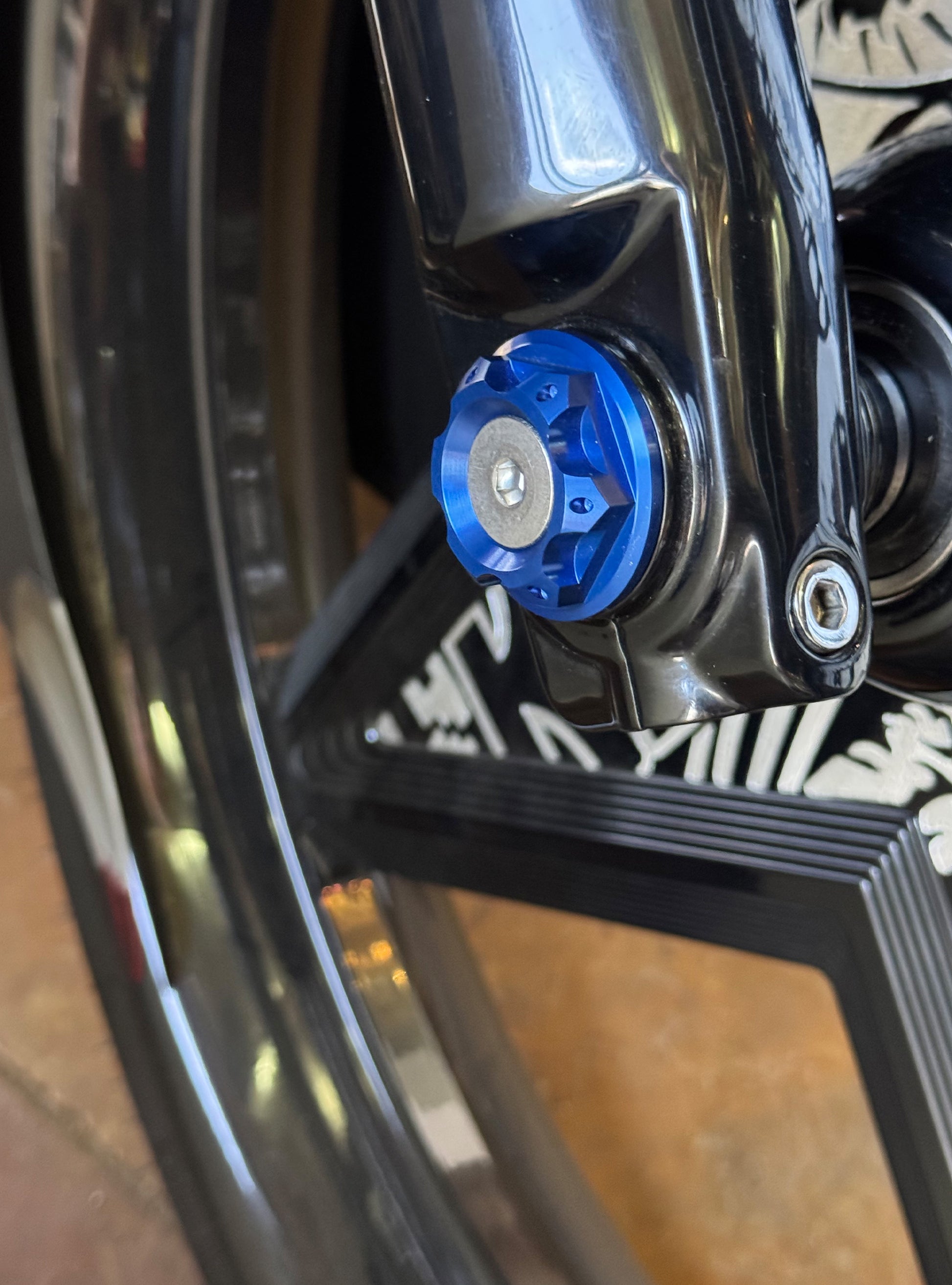 The "Yaxle" Custom Front Axle makes your boring stock forks look completely custom by removing the big ugly stock axle and replacing it with our killer performance minded custom end caps.