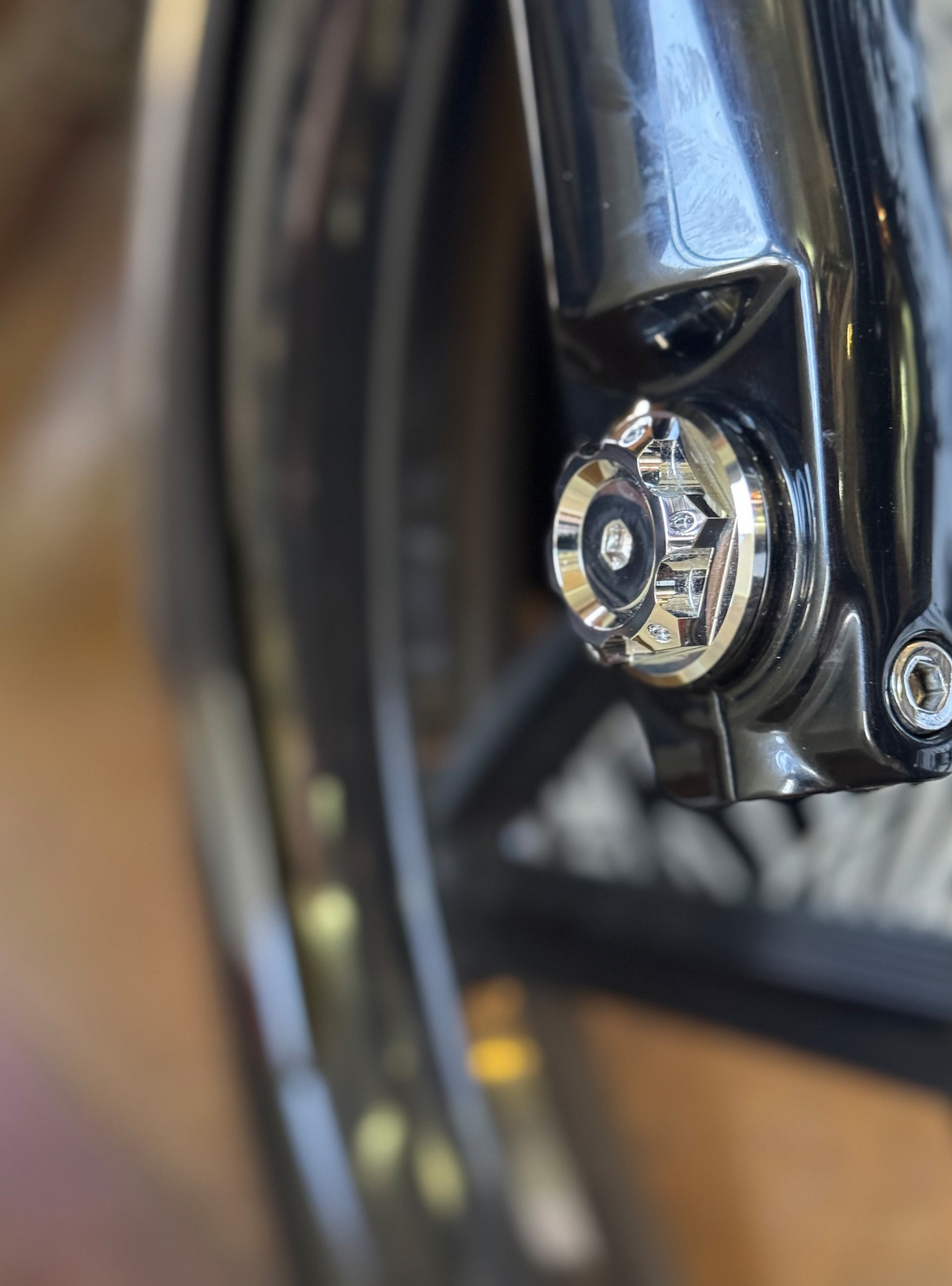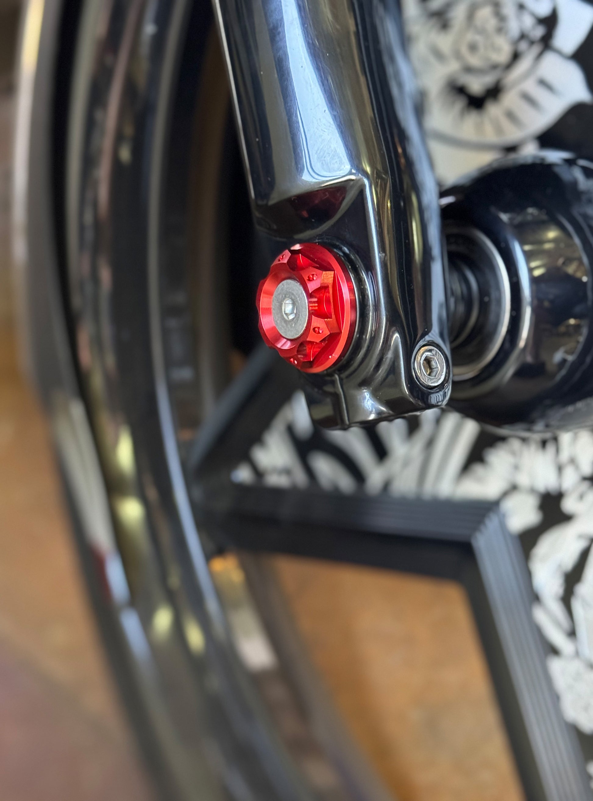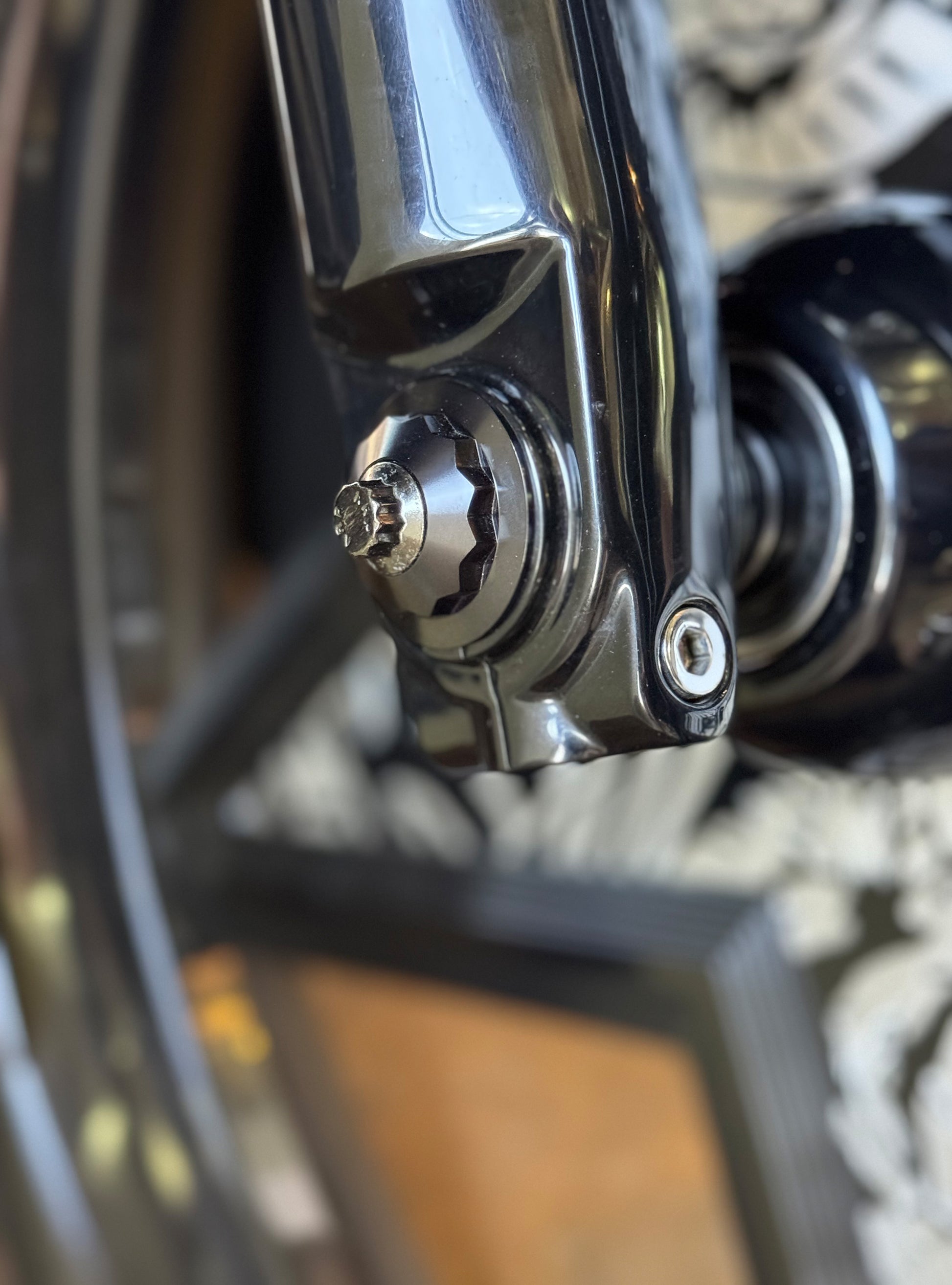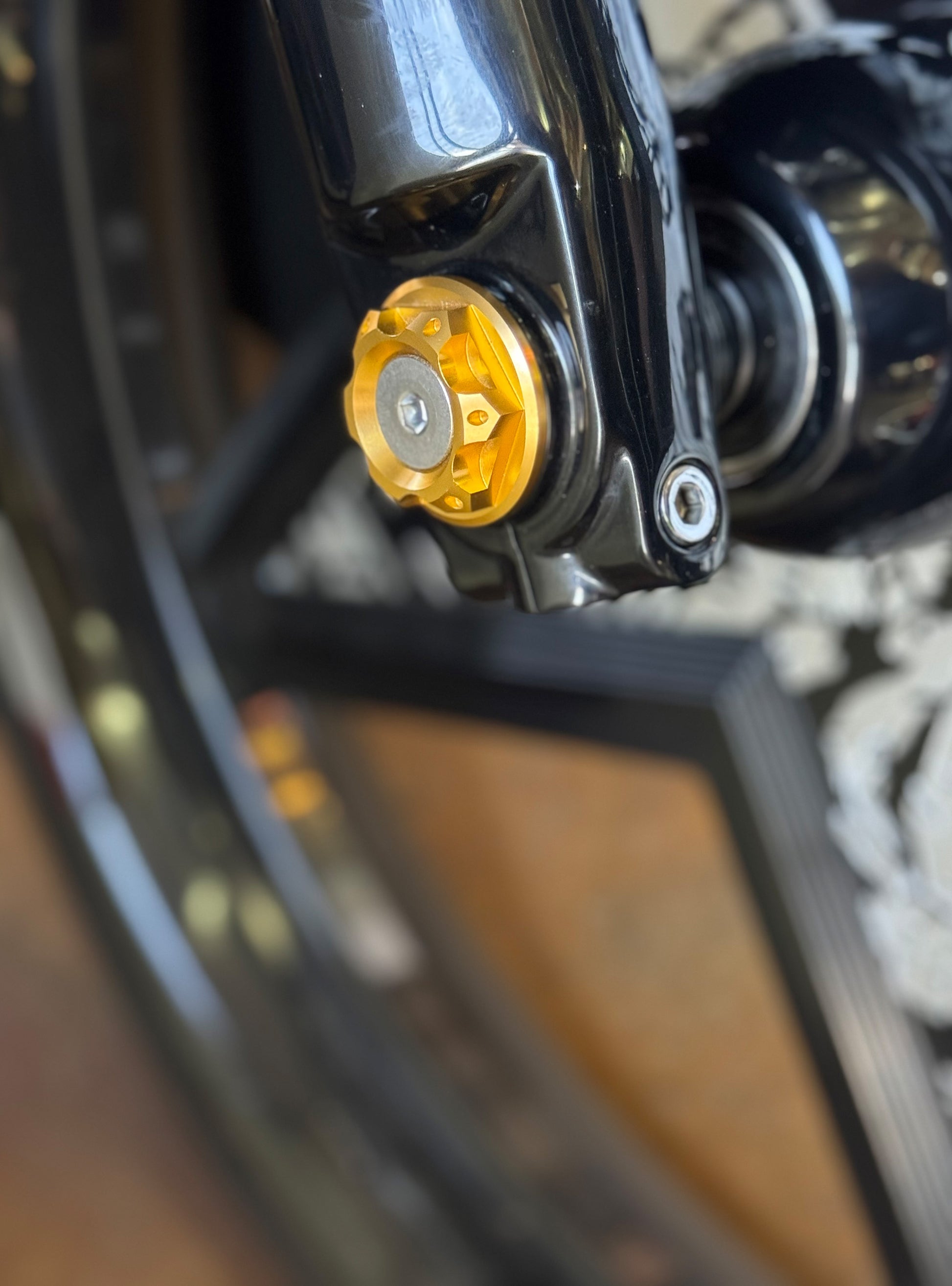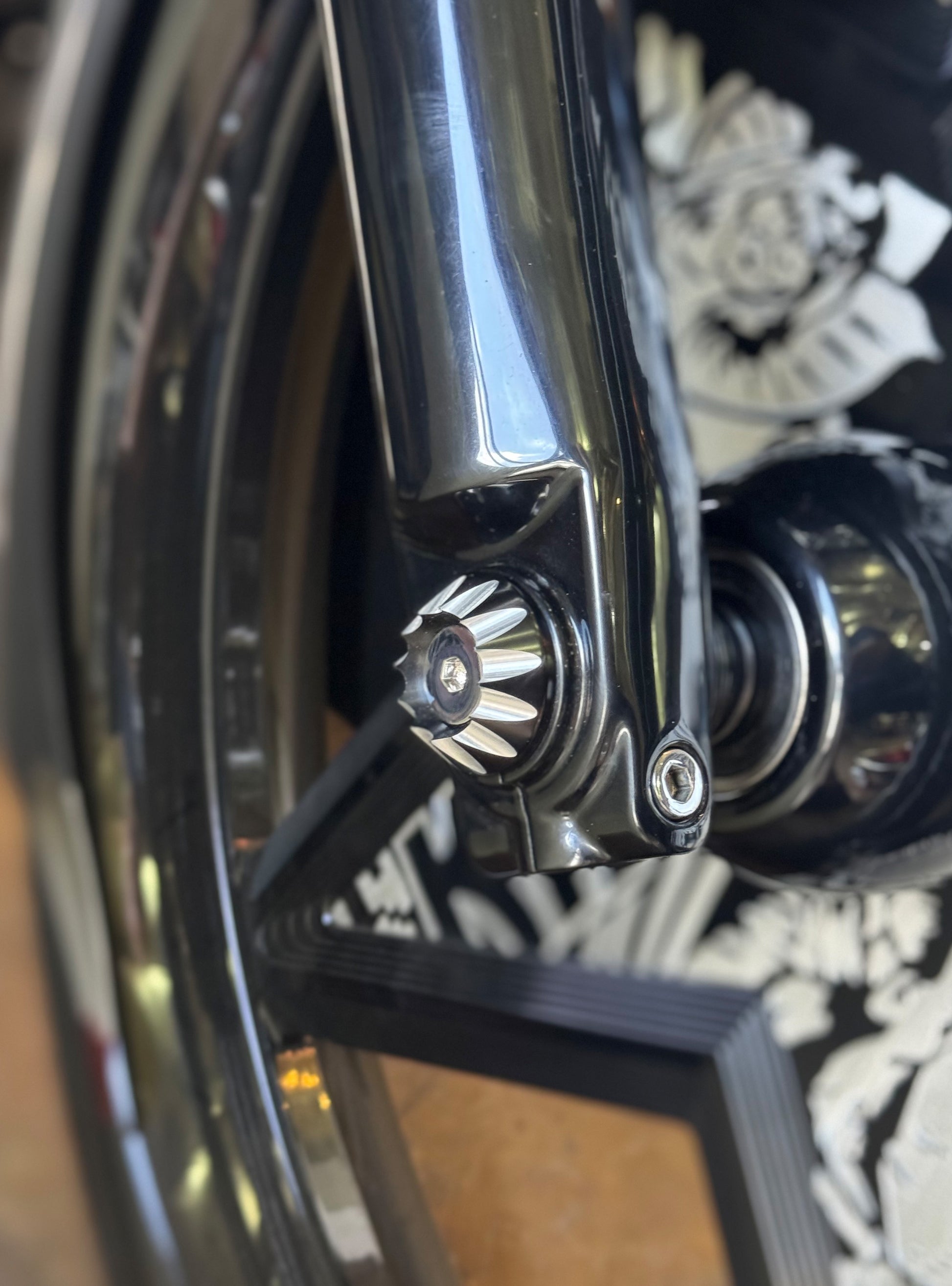 The "Yaxle" Custom Front Axle makes your boring stock forks look completely custom by removing the big ugly stock axle and replacing it with our killer performance minded custom end caps.
