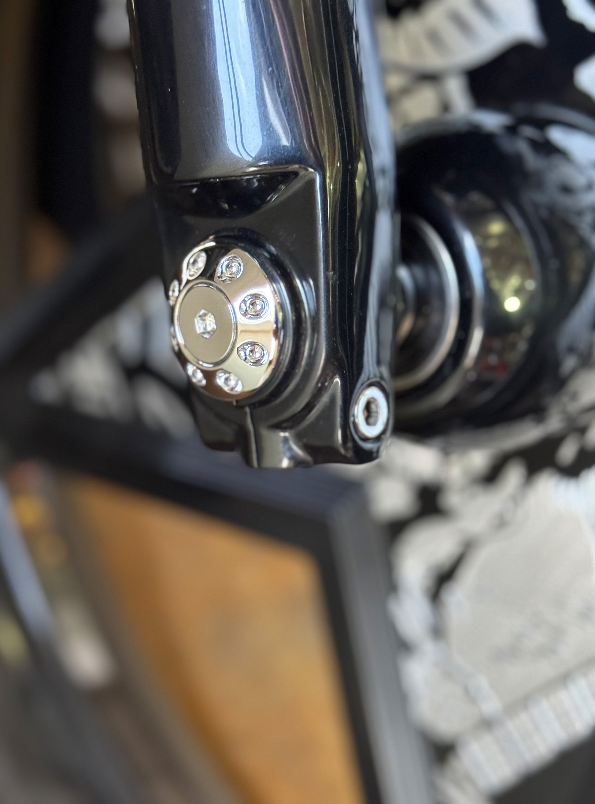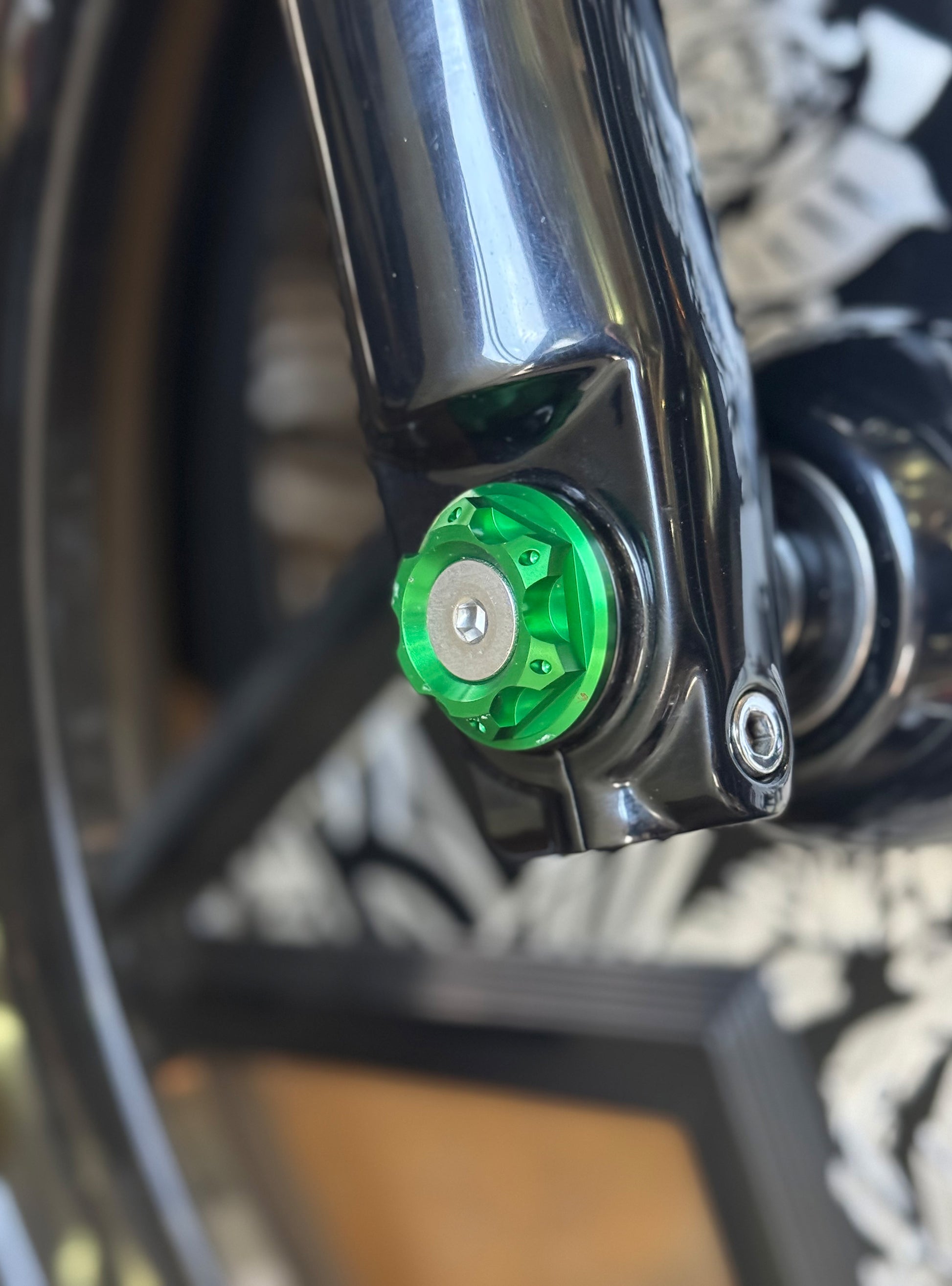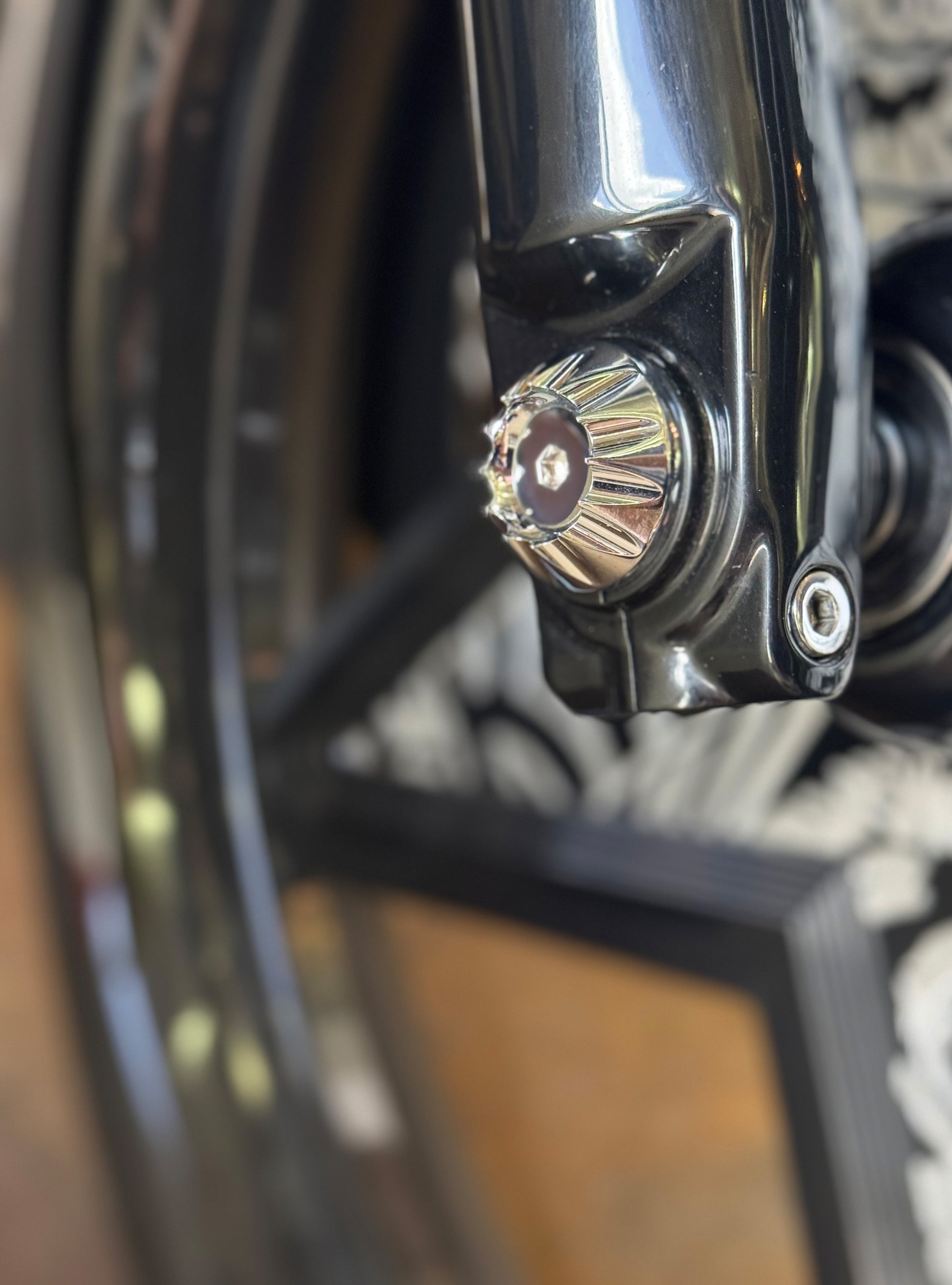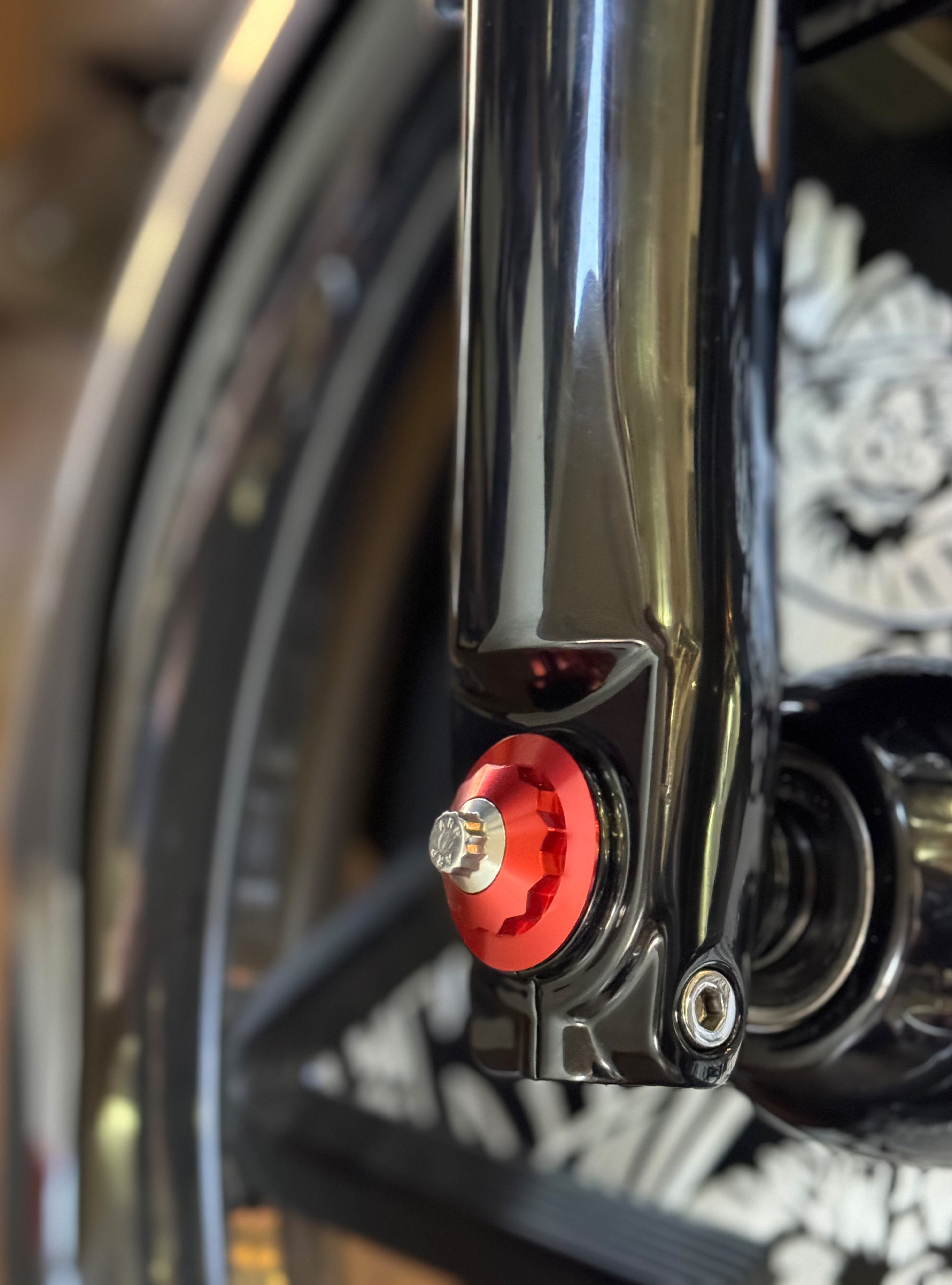 The "Yaxle" Custom Front Axle makes your boring stock forks look completely custom by removing the big ugly stock axle and replacing it with our killer performance minded custom end caps.