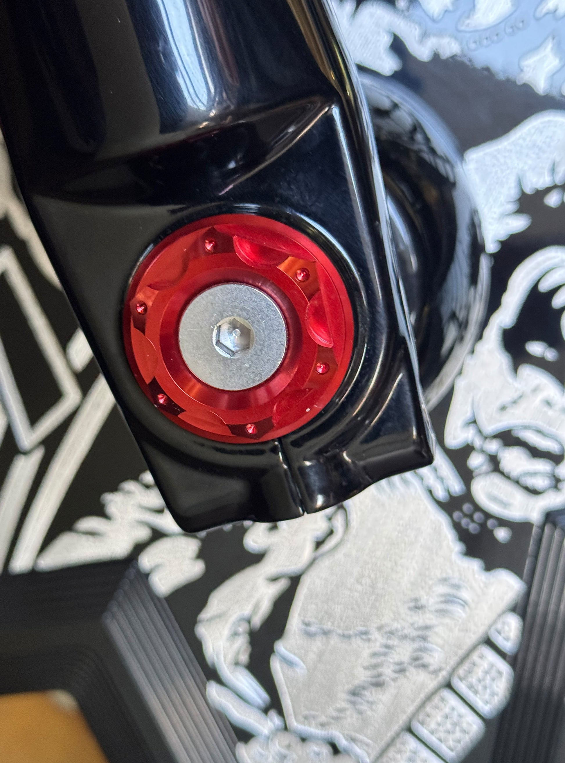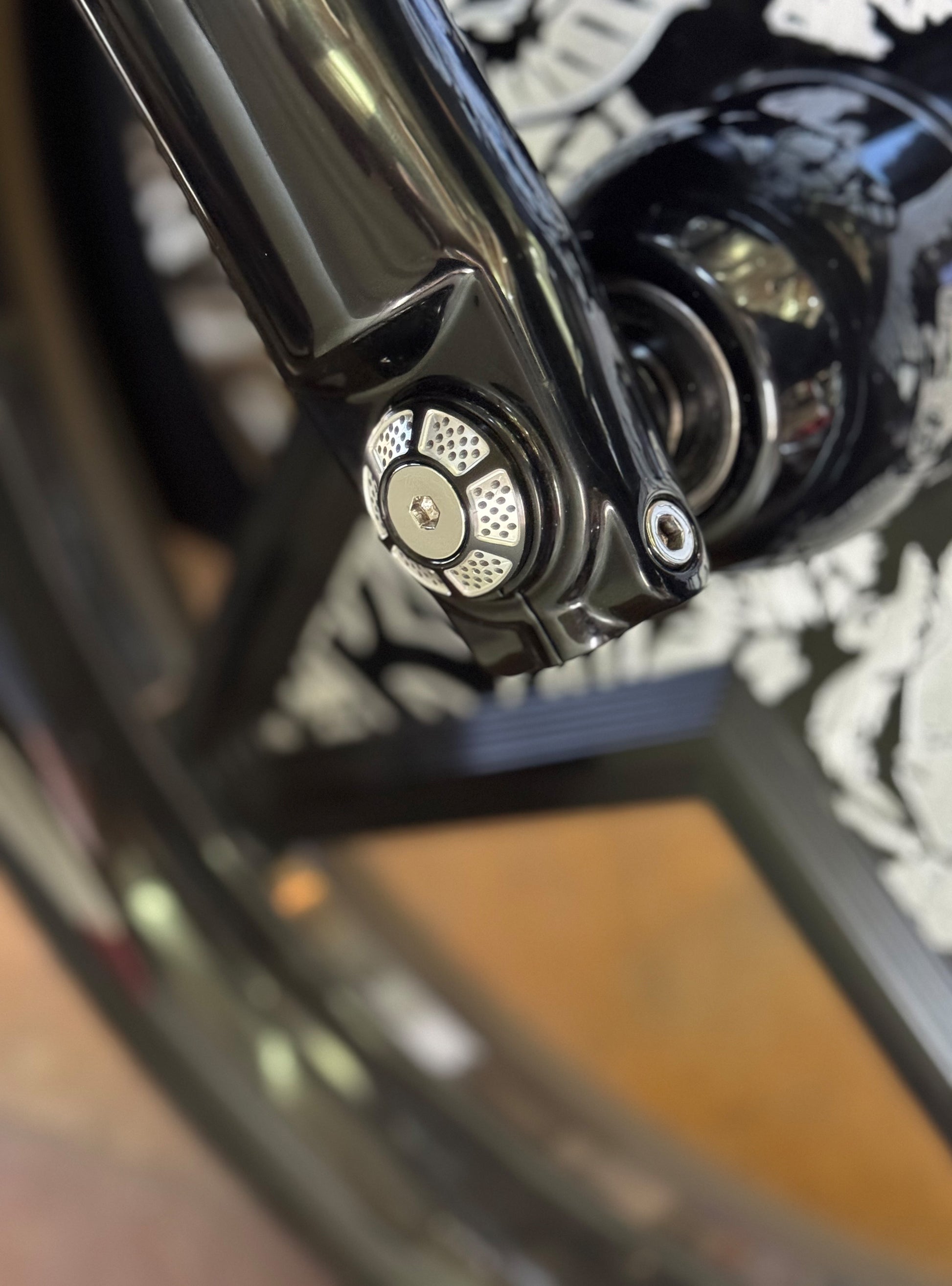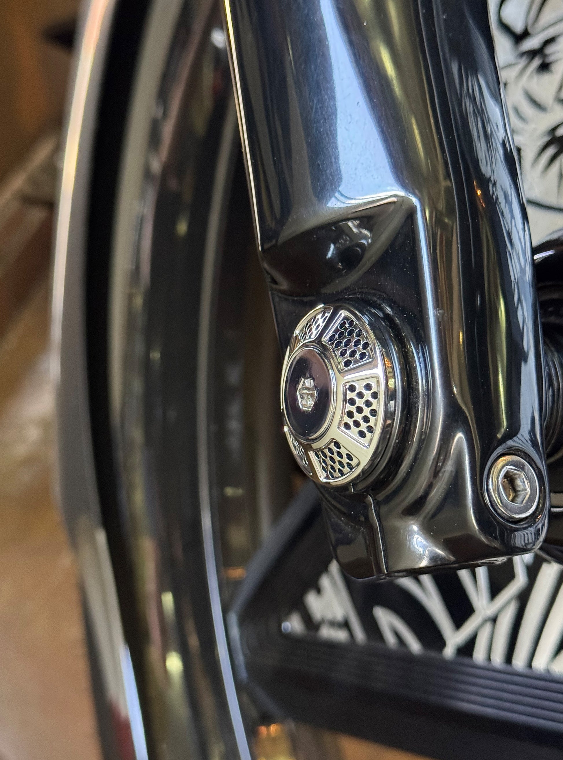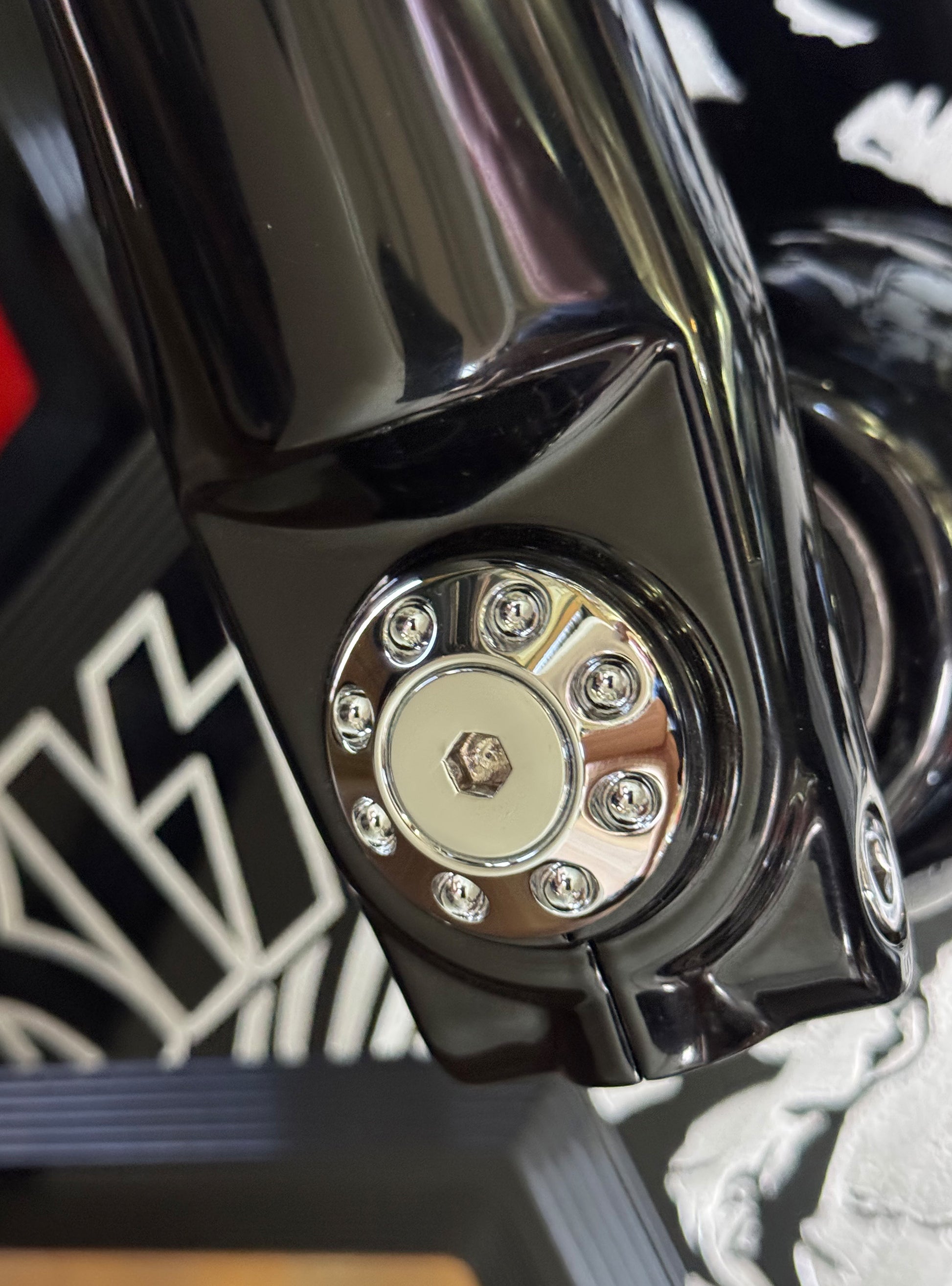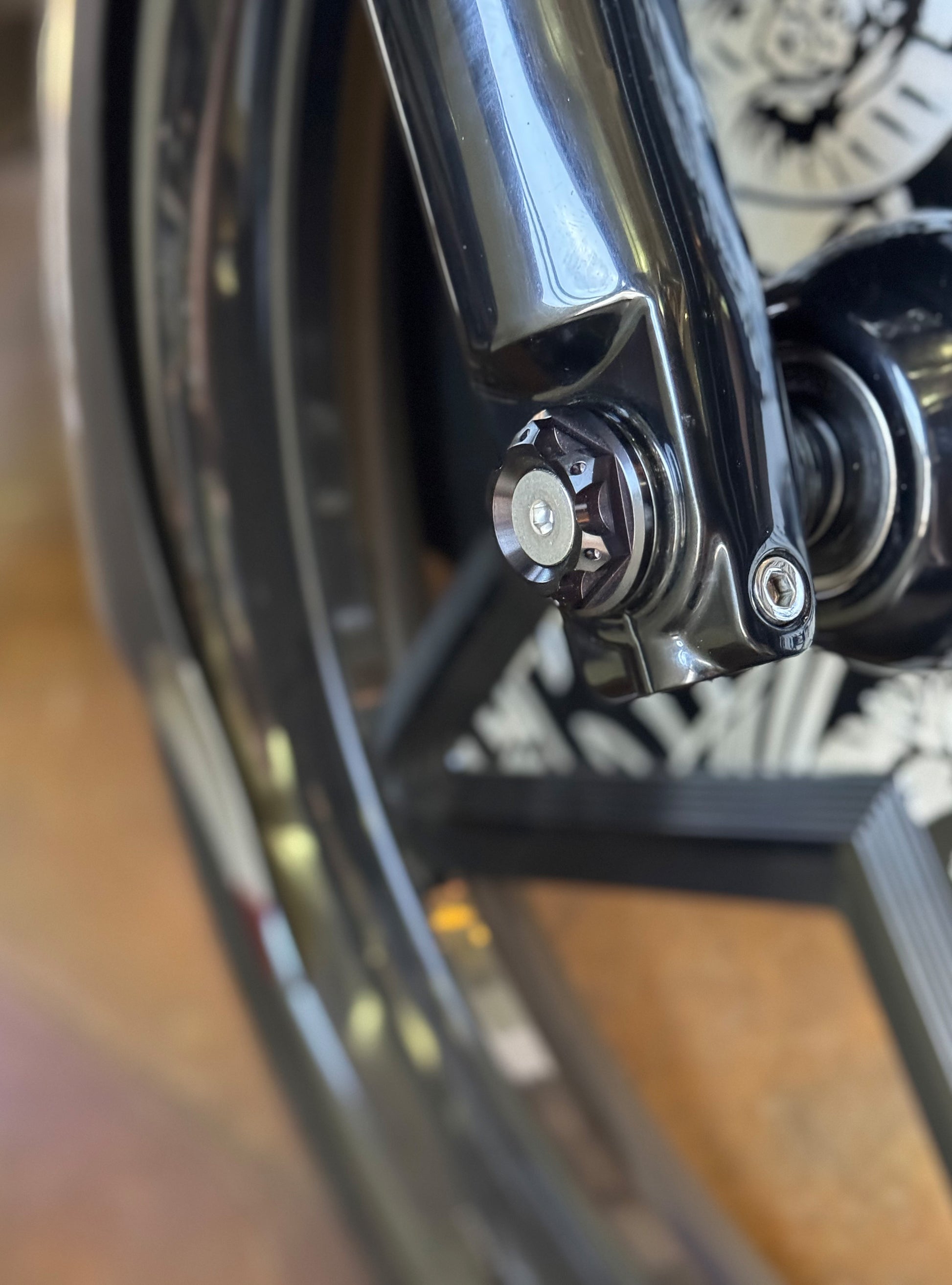 The "Yaxle" Custom Front Axle makes your boring stock forks look completely custom by removing the big ugly stock axle and replacing it with our killer performance minded custom end caps.